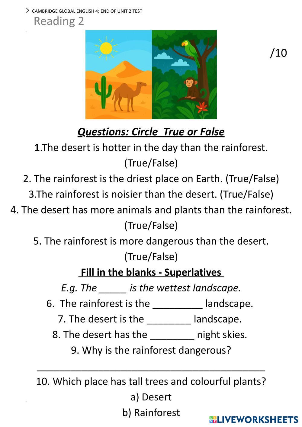 Created bySinead ESL English A1-Beginner Reading English Author's Instructions reading My Google Classroom Courses × 0 classes selected (0 students total) Quick Access Select all classes (0 classes) All Classes Loading courses... Cancelar Share Share to selected Course __COURSE_NAME__ __STUDENT_NAME__ (__STUDENT_EMAIL__) Unit 2 Reading: Comparatives and Superlatives Download Worksheet Validation Comprobar mis respuestas Emails my answers to my teacher Nombre completo Group/level Asignatura Teacher's email or key code Close Submit Validating worksheet... (12) Your answers have been sent to your teacher. Good luck! OK We encountered an error submitting your answers. Please try again. OK Anuncio | Ir sin anuncios Created bySinead ESL English A1-Beginner Reading English Author's Instructions reading Explore Worksheets Dialogue: At the nurse's office ESL A1-Beginner Dialogue: At the nurse's office Reading - ESL Order the sentences to make a dialogue TERM 1 TEST 2ESO RD ESL A1-Beginner TERM 1 TEST 2ESO RD Reading - ESL Complete all the gaps in the exam in English. Then click "Finish", then "Emails my answers to my teacher", then complete your information (your name, your group= 2ºB, subject= English and the teacher's code: a0coo2ibm2. KL1 Online 10.3 - Homework ESL A1-Beginner KL1 Online 10.3 - Homework Reading - ESL Read the text and put T if the sentences are true and F if they’re false. THEME 1 SCHOOL LIFE QUESTIONS ESL A1-Beginner THEME 1 SCHOOL LIFE QUESTIONS Reading - ESL MATCH THE SENTENCES