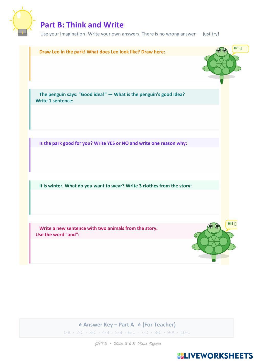 Created byhava ESL English A1 (Principiante) Lectura English Instrucciones del autor טקסט על אוצר מילים יחידה 2 3 ושאלות My Google Classroom Courses × 0 classes selected (0 students total) Quick Access Select all classes (0 classes) All Classes Loading courses... Cancelar Share Share to selected Course __COURSE_NAME__ __STUDENT_NAME__ (__STUDENT_EMAIL__) Jet 2 unit 2-3 text Descargar Worksheet Validation Comprobar mis respuestas Emails my answers to my teacher Nombre completo Group/level Asignatura Teacher's email or key code Close Submit Validating worksheet... (12) Your answers have been sent to your teacher. Good luck! OK We encountered an error submitting your answers. Please try again. OK Anuncio | Ir sin anuncios Created byhava ESL English A1 (Principiante) Lectura English Instrucciones del autor טקסט על אוצר מילים יחידה 2 3 ושאלות Explora las hojas de trabajo Simple Present - Daily Routines ESL A1 Simple Present - Daily Routines Reading - ESL Read the text and do the following activities: 1.- Read and write the correct verb. 2.- Read and choose True or False 3. Write about your routines QM 2 Quiz time U 4-6 ESL A1 QM 2 Quiz time U 4-6 Reading - ESL Виконати тестові завдання. Вибрати правильний варіант до кожного речення. Tom's Daily Routine - Reading Comprehension ESL A1 Tom's Daily Routine - Reading Comprehension Reading - ESL This A2-level ESL worksheet includes a description of a kid's routine in the Present Simple, followed by some true-or-false sentences to test your students' reading comprehension skills in English. Family Members ESL A1 Family Members Reading - ESL Match