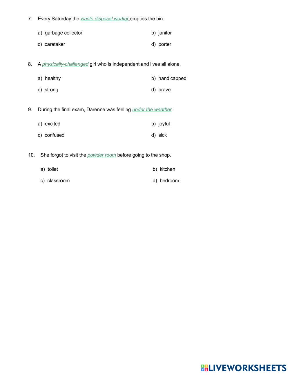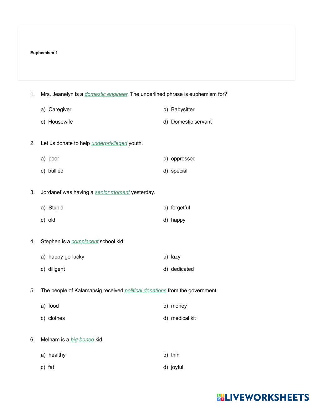 Created byRicardo Hernandez ESL English B2 (Intermedio Alto) Lectura English Instrucciones del autor Choose the correct option. My Google Classroom Courses × 0 classes selected (0 students total) Quick Access Select all classes (0 classes) All Classes Loading courses... Cancelar Share Share to selected Course __COURSE_NAME__ __STUDENT_NAME__ (__STUDENT_EMAIL__) Euphemism 1 Descargar Worksheet Validation Comprobar mis respuestas Emails my answers to my teacher Nombre completo Group/level Asignatura Teacher's email or key code Close Submit Validating worksheet... (12) Your answers have been sent to your teacher. Good luck! OK We encountered an error submitting your answers. Please try again. OK Anuncio | Ir sin anuncios Created byRicardo Hernandez ESL English B2 (Intermedio Alto) Lectura English Instrucciones del autor Choose the correct option. Explora las hojas de trabajo USED CAR ESL B2 USED CAR Reading - ESL התאימו את התשובות לשאלות הנכונות B2 W4 READING - JOBS ESL B2 B2 W4 READING - JOBS Reading - ESL Choose B2 W4 READING - GLOBAL WARMING ESL B2 B2 W4 READING - GLOBAL WARMING Reading - ESL Choose Family matters ESL B2 Family matters Reading - ESL Answer the questions