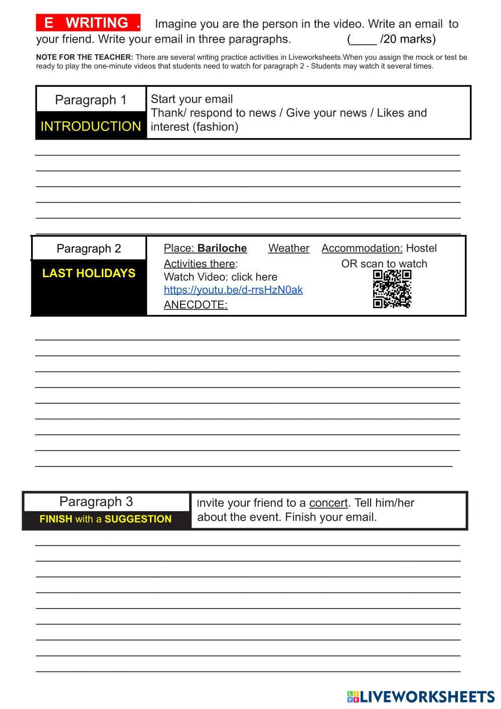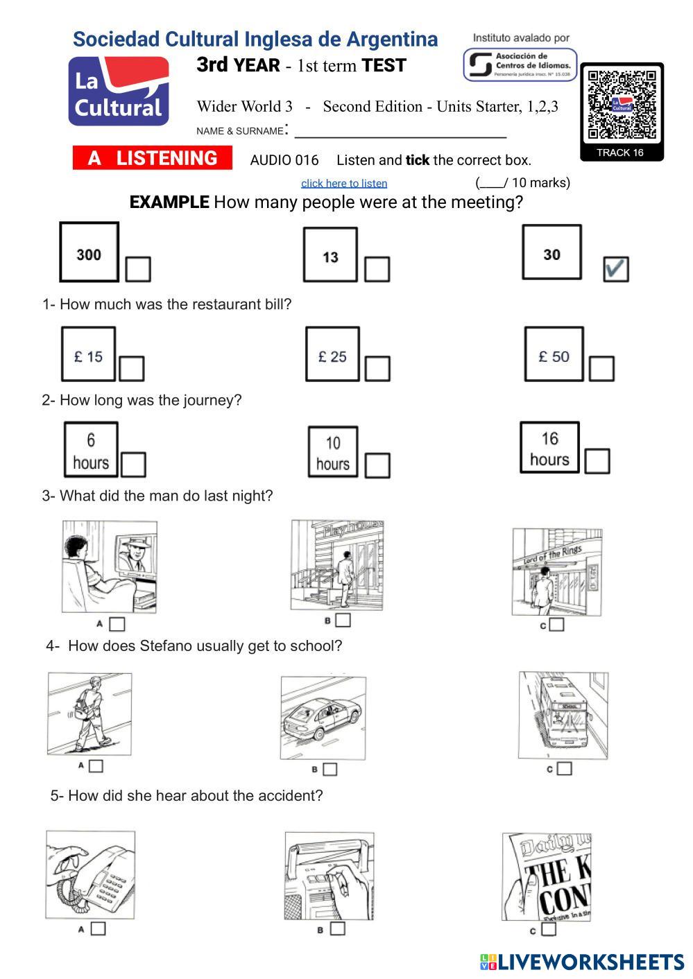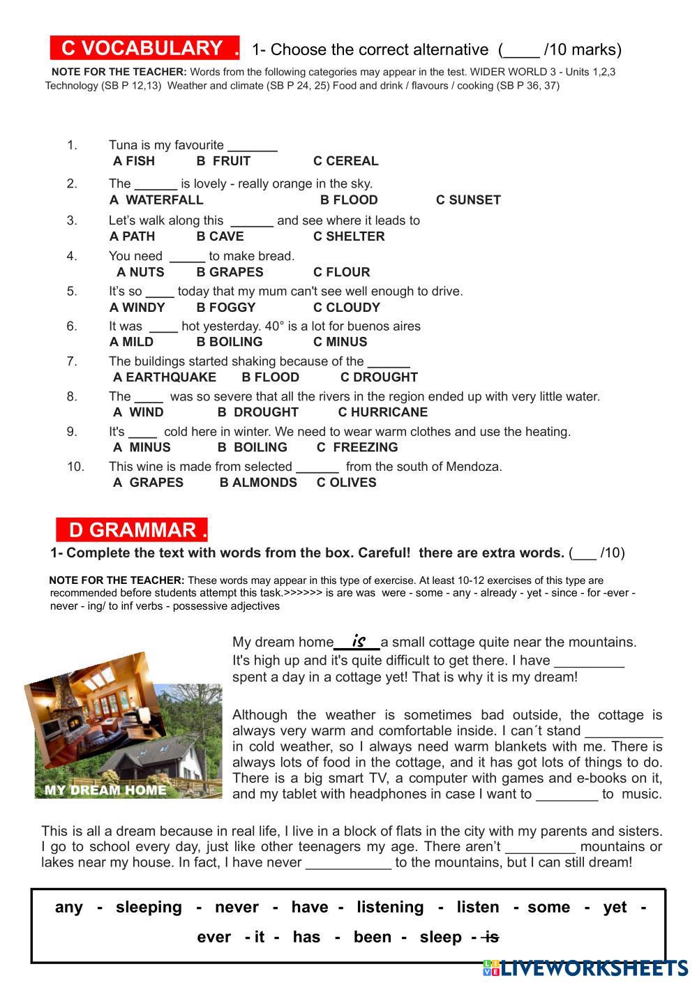 Created by thirdyearlacultural ESL English A2 (Básico) Lectura English Instrucciones del autor test My Google Classroom Courses × 0 classes selected (0 students total) Quick Access Select all classes (0 classes) All Classes Loading courses... Cancelar Share Share to selected Course __COURSE_NAME__ __STUDENT_NAME__ (__STUDENT_EMAIL__) 3Y TEST 1 (Wider World 3 Second Edition) Units 1, 2, 3 Descargar Worksheet Validation Comprobar mis respuestas Emails my answers to my teacher Nombre completo Group/level Asignatura Teacher's email or key code Close Submit Validating worksheet... (12) Your answers have been sent to your teacher. Good luck! OK We encountered an error submitting your answers. Please try again. OK Anuncio | Ir sin anuncios Created by thirdyearlacultural ESL English A2 (Básico) Lectura English Instrucciones del autor test Explora las hojas de trabajo 6Y MOCK 3 (Gold Experience B2) Unit 7, 8, 9 ESL A2 6Y MOCK 3 (Gold Experience B2) Unit 7, 8, 9 Reading - ESL Written test RESILIENCE ESL A2 RESILIENCE Reading - ESL Complete the worksheet My last summer ESL A2 My last summer Reading - ESL read the text and do the exercises Reading a recipe ESL A2 Reading a recipe Reading - ESL Complete the activities
