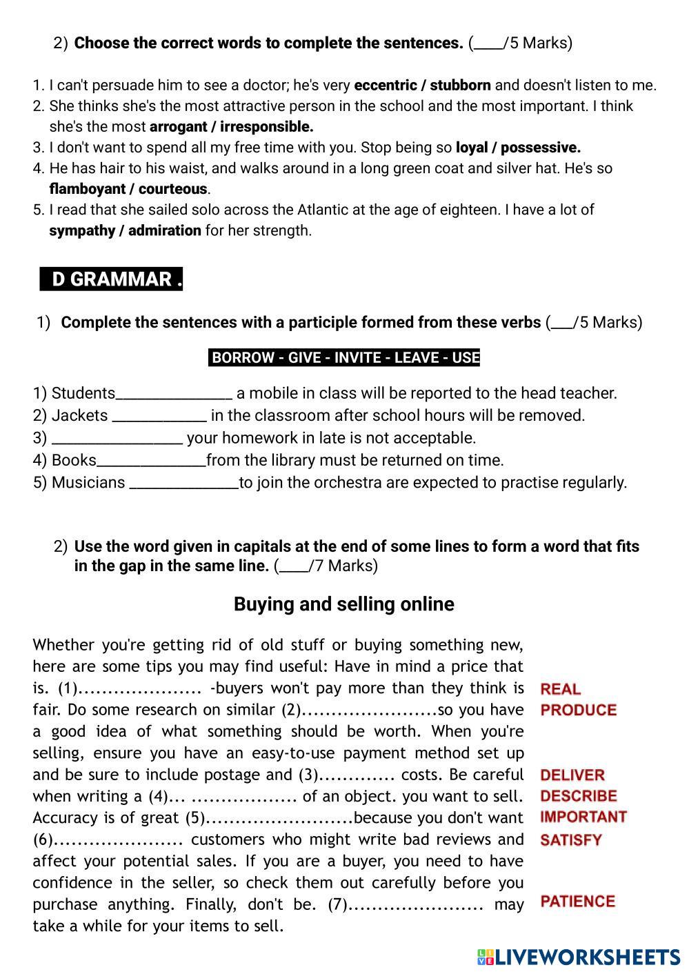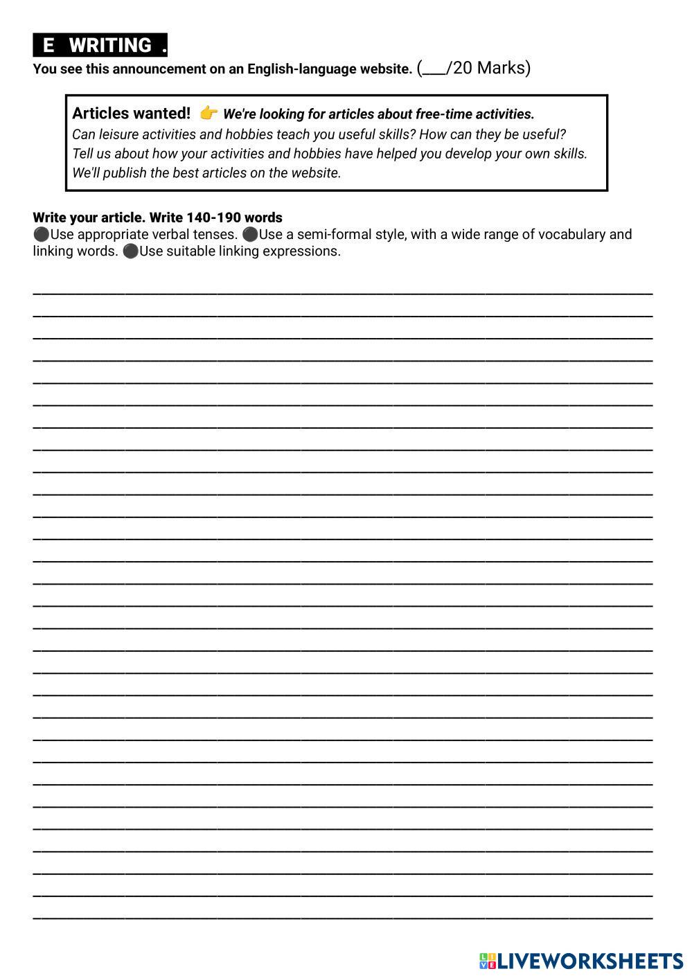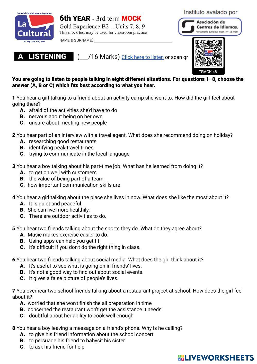 Created by sixthyearlacultural ESL English A2 (Básico) Lectura English Instrucciones del autor Written test My Google Classroom Courses × 0 classes selected (0 students total) Quick Access Select all classes (0 classes) All Classes Loading courses... Cancelar Share Share to selected Course __COURSE_NAME__ __STUDENT_NAME__ (__STUDENT_EMAIL__) 6Y MOCK 3 (Gold Experience B2) Unit 7, 8, 9 Descargar Worksheet Validation Comprobar mis respuestas Emails my answers to my teacher Nombre completo Group/level Asignatura Teacher's email or key code Close Submit Validating worksheet... (12) Your answers have been sent to your teacher. Good luck! OK We encountered an error submitting your answers. Please try again. OK Anuncio | Ir sin anuncios Created by sixthyearlacultural ESL English A2 (Básico) Lectura English Instrucciones del autor Written test Explora las hojas de trabajo 3Y TEST 1 (Wider World 3 Second Edition) Units 1, 2, 3 ESL A2 3Y TEST 1 (Wider World 3 Second Edition) Units 1, 2, 3 Reading - ESL test RESILIENCE ESL A2 RESILIENCE Reading - ESL Complete the worksheet My last summer ESL A2 My last summer Reading - ESL read the text and do the exercises Reading a recipe ESL A2 Reading a recipe Reading - ESL Complete the activities