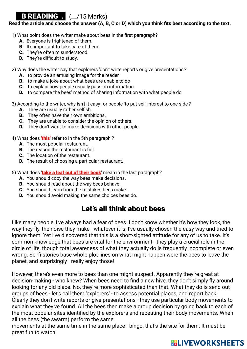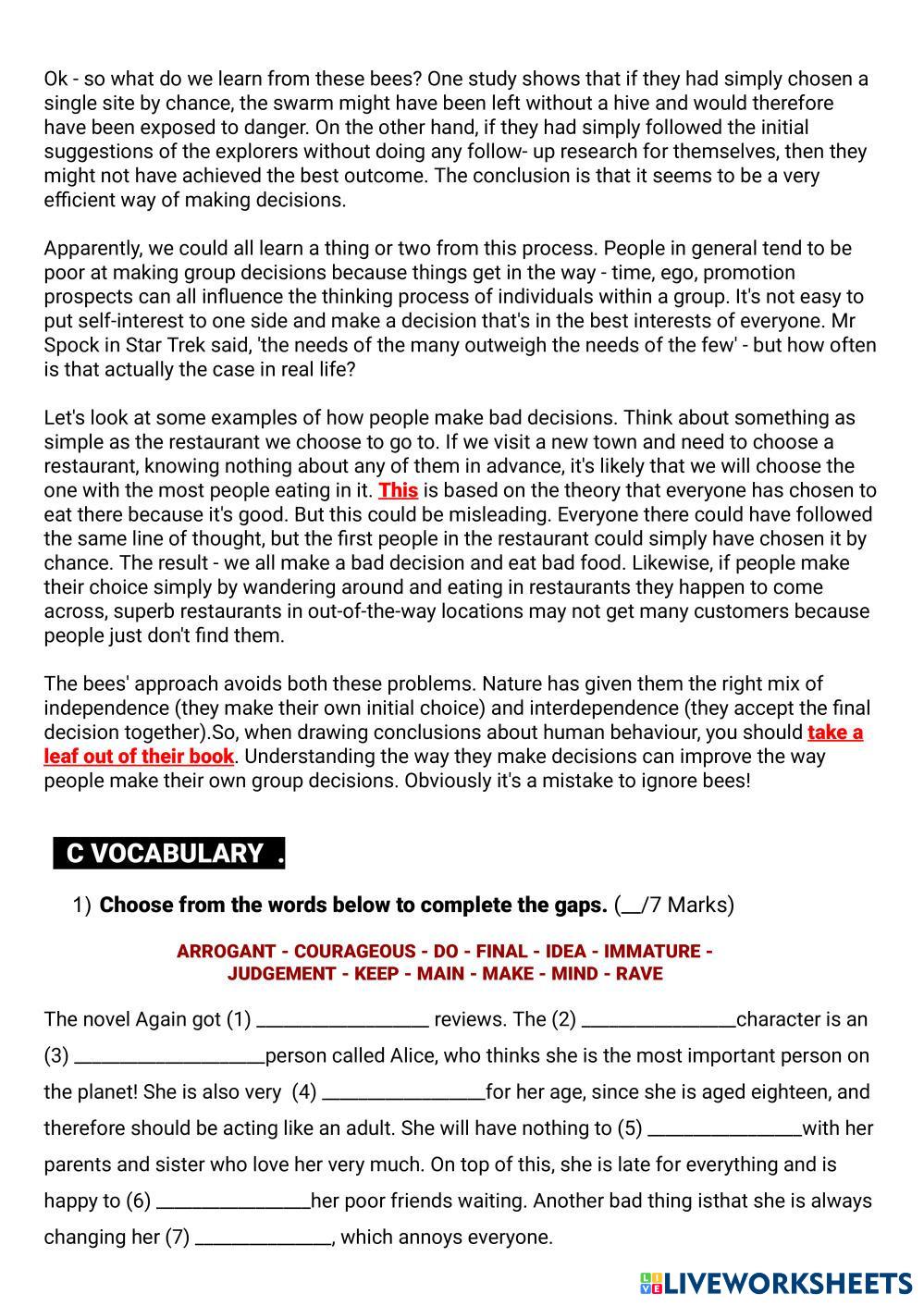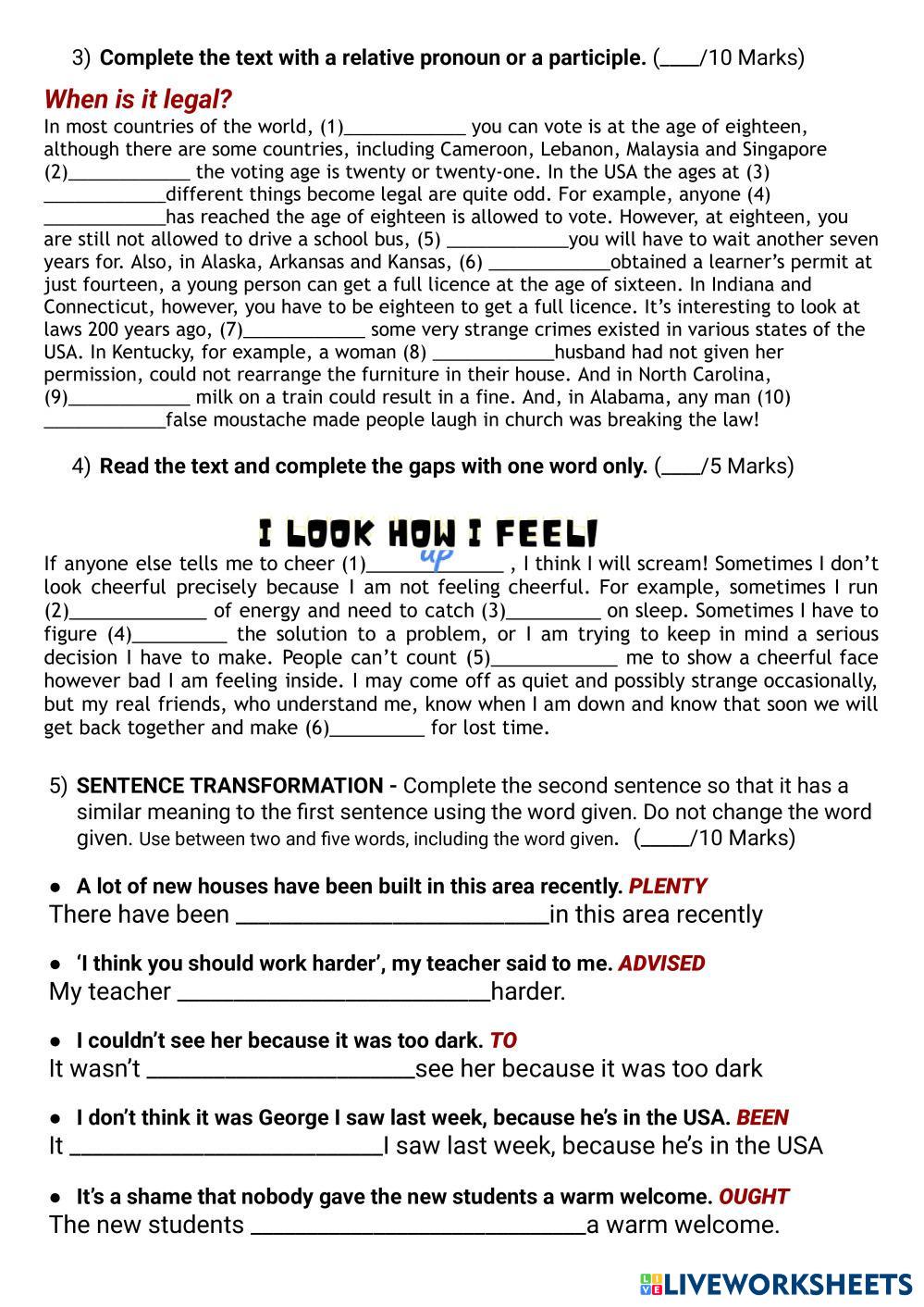 Created by sixthyearlacultural ESL English A2 (Básico) Lectura English Instrucciones del autor Written test My Google Classroom Courses × 0 classes selected (0 students total) Quick Access Select all classes (0 classes) All Classes Loading courses... Cancelar Share Share to selected Course __COURSE_NAME__ __STUDENT_NAME__ (__STUDENT_EMAIL__) 6Y MOCK 3 (Gold Experience B2) Unit 7, 8, 9 Descargar Worksheet Validation Comprobar mis respuestas Emails my answers to my teacher Nombre completo Group/level Asignatura Teacher's email or key code Close Submit Validating worksheet... (12) Your answers have been sent to your teacher. Good luck! OK We encountered an error submitting your answers. Please try again. OK Anuncio | Ir sin anuncios Created by sixthyearlacultural ESL English A2 (Básico) Lectura English Instrucciones del autor Written test Explora las hojas de trabajo 3Y TEST 1 (Wider World 3 Second Edition) Units 1, 2, 3 ESL A2 3Y TEST 1 (Wider World 3 Second Edition) Units 1, 2, 3 Reading - ESL test RESILIENCE ESL A2 RESILIENCE Reading - ESL Complete the worksheet My last summer ESL A2 My last summer Reading - ESL read the text and do the exercises Reading a recipe ESL A2 Reading a recipe Reading - ESL Complete the activities