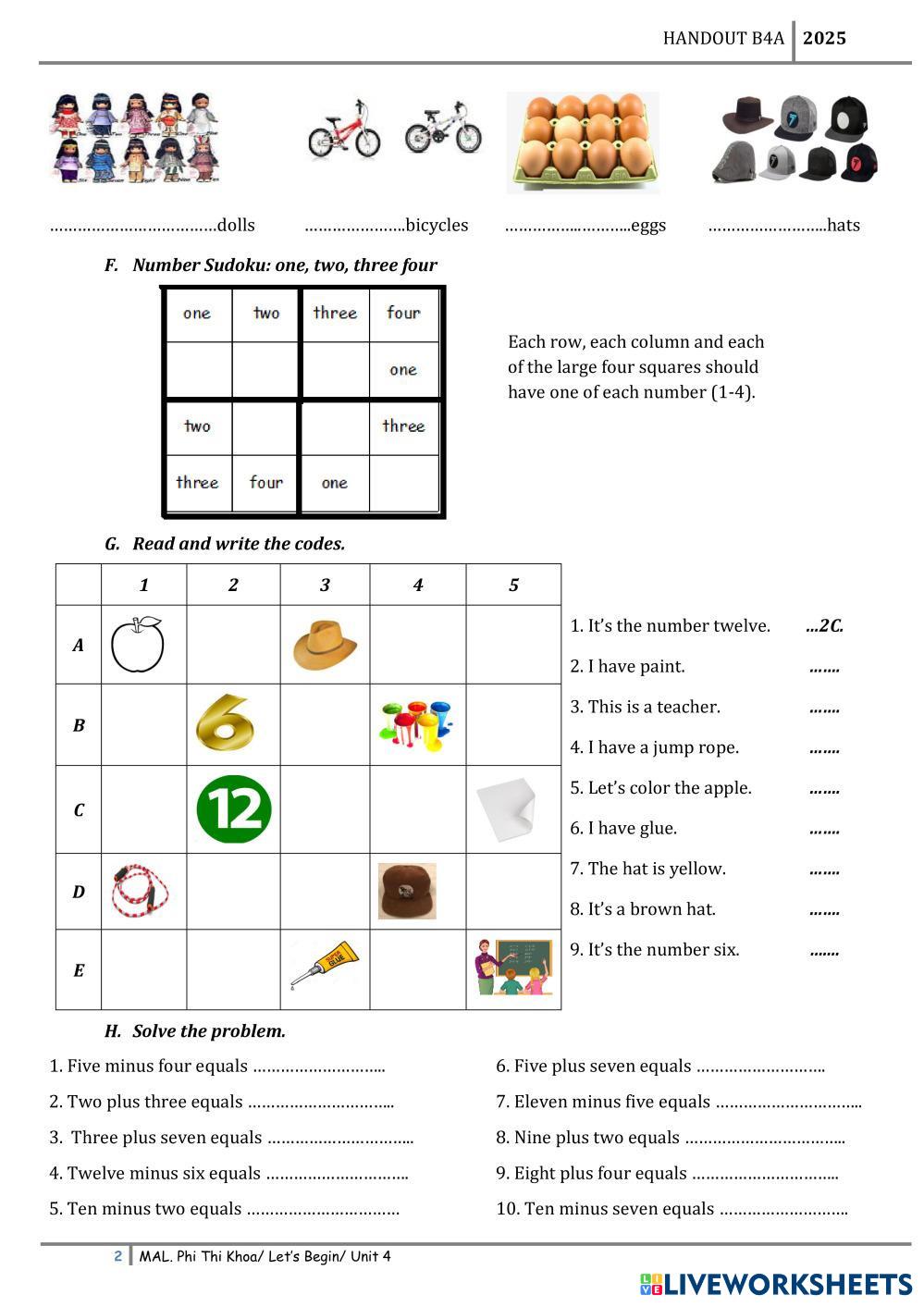 Created byPhi Thi Khoa ESL English A1-Beginner Vocabulary English Author's Instructions Number 0-12 My Google Classroom Courses × 0 classes selected (0 students total) Quick Access Select all classes (0 classes) All Classes Loading courses... Cancelar Share Share to selected Course __COURSE_NAME__ __STUDENT_NAME__ (__STUDENT_EMAIL__) B4A Download Worksheet Validation Comprobar mis respuestas Emails my answers to my teacher Nombre completo Group/level Asignatura Teacher's email or key code Close Submit Validating worksheet... (12) Your answers have been sent to your teacher. Good luck! OK We encountered an error submitting your answers. Please try again. OK Anuncio | Ir sin anuncios Created byPhi Thi Khoa ESL English A1-Beginner Vocabulary English Author's Instructions Number 0-12 Explore Worksheets FF1-UNIT 9.3 THAILAND 02/11 ESL A1-Beginner FF1-UNIT 9.3 THAILAND 02/11 Vocabulary - ESL unit 9 Online_Foreign Teacher_S3_W13_U4_Vocabulary Revision & Presentation ESL A1-Beginner Online_Foreign Teacher_S3_W13_U4_Vocabulary Revision & Presentation Vocabulary - ESL StarLink Zero Conditional ESL A1-Beginner Zero Conditional Vocabulary - ESL 4th part of a set of CONDITIONALS. A very simple and clear ws to introduce the zero conditional. Hope it´s useful. Classroom objects 2 ESL A1-Beginner Classroom objects 2 Vocabulary - ESL This worksheet is meant to be done after the worksheet number 35966. It is designed to help young children to learn vocabulary without difficulty. The words are added one by one, so that it is very easy to solve the worksheet even if students don't know the vocabulary very well yet.