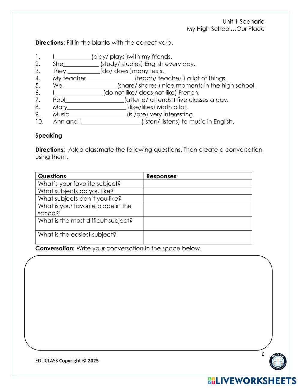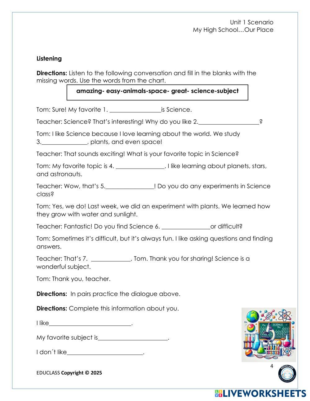 Created by JCV240982 ESL A1 (Principiante) Vocabulario English Instrucciones del autor Work on the material My Google Classroom Courses × 0 classes selected (0 students total) Quick Access Select all classes (0 classes) All Classes Loading courses... Cancelar Share Share to selected Course __COURSE_NAME__ __STUDENT_NAME__ (__STUDENT_EMAIL__) week 1 8th Descargar Worksheet Validation Comprobar mis respuestas Emails my answers to my teacher Nombre completo Group/level Asignatura Teacher's email or key code Close Submit Validating worksheet... (12) Your answers have been sent to your teacher. Good luck! OK We encountered an error submitting your answers. Please try again. OK Anuncio | Ir sin anuncios Created by JCV240982 ESL A1 (Principiante) Vocabulario English Instrucciones del autor Work on the material Explora las hojas de trabajo Lesson 1: Hi! What’s your name? ESL A1 Lesson 1: Hi! What’s your name? Vocabulary - ESL Read and answer. Press FINISH to complete it. Exercise 11 Week 4 ESL A1 Exercise 11 Week 4 Vocabulary - ESL Read carefully and choose the correct alternative. Mi familia ESL A1 Mi familia Vocabulary - ESL Coloca el parentesco donde corresponda Exercise 9 Week 4 ESL A1 Exercise 9 Week 4 Vocabulary - ESL Read carefully and complete the exercise.