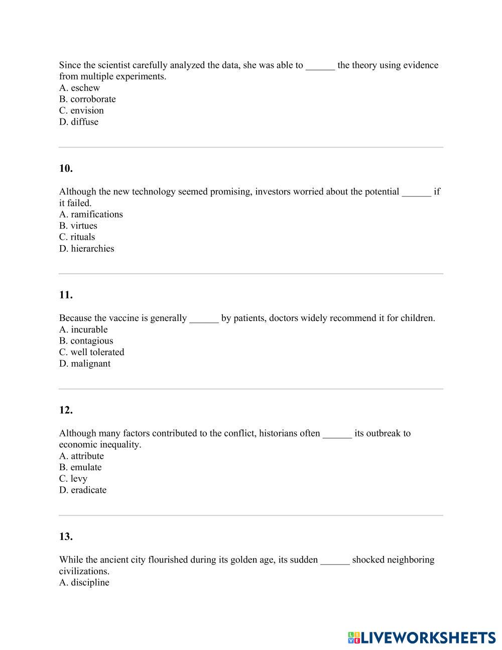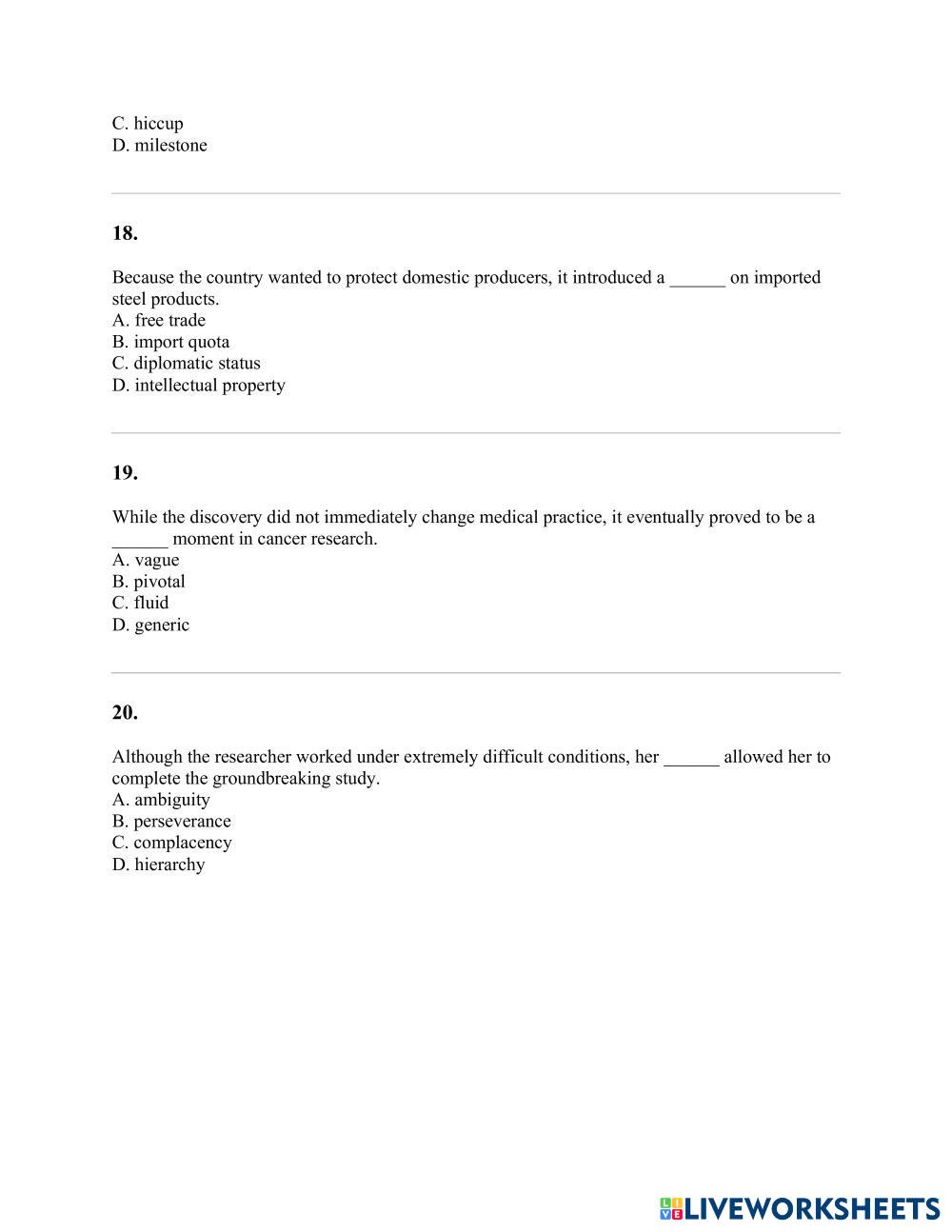 Created by thuydtp ESL English B2 (Intermedio Alto) Vocabulario English Instrucciones del autor do it My Google Classroom Courses × 0 classes selected (0 students total) Quick Access Select all classes (0 classes) All Classes Loading courses... Cancelar Share Share to selected Course __COURSE_NAME__ __STUDENT_NAME__ (__STUDENT_EMAIL__) SAMPLE TEST 1 Descargar Worksheet Validation Comprobar mis respuestas Emails my answers to my teacher Nombre completo Group/level Asignatura Teacher's email or key code Close Submit Validating worksheet... (12) Your answers have been sent to your teacher. Good luck! OK We encountered an error submitting your answers. Please try again. OK Anuncio | Ir sin anuncios Created by thuydtp ESL English B2 (Intermedio Alto) Vocabulario English Instrucciones del autor do it Explora las hojas de trabajo Synchronize 4 Unit 4 Picture this ESL B2 Synchronize 4 Unit 4 Picture this Vocabulary - ESL Follow the instructions Adjectives of Personality - ESL Worksheet ESL B2 Adjectives of Personality - ESL Worksheet Vocabulary - ESL In this B2-level ESL worksheet, your students must complete each sentence with the correct adjective from the word bank. SAMPLE TEST 2 ESL B2 SAMPLE TEST 2 Vocabulary - ESL Do it mega goal 1.2 vocabulary ESL B2 mega goal 1.2 vocabulary Vocabulary - ESL vocab