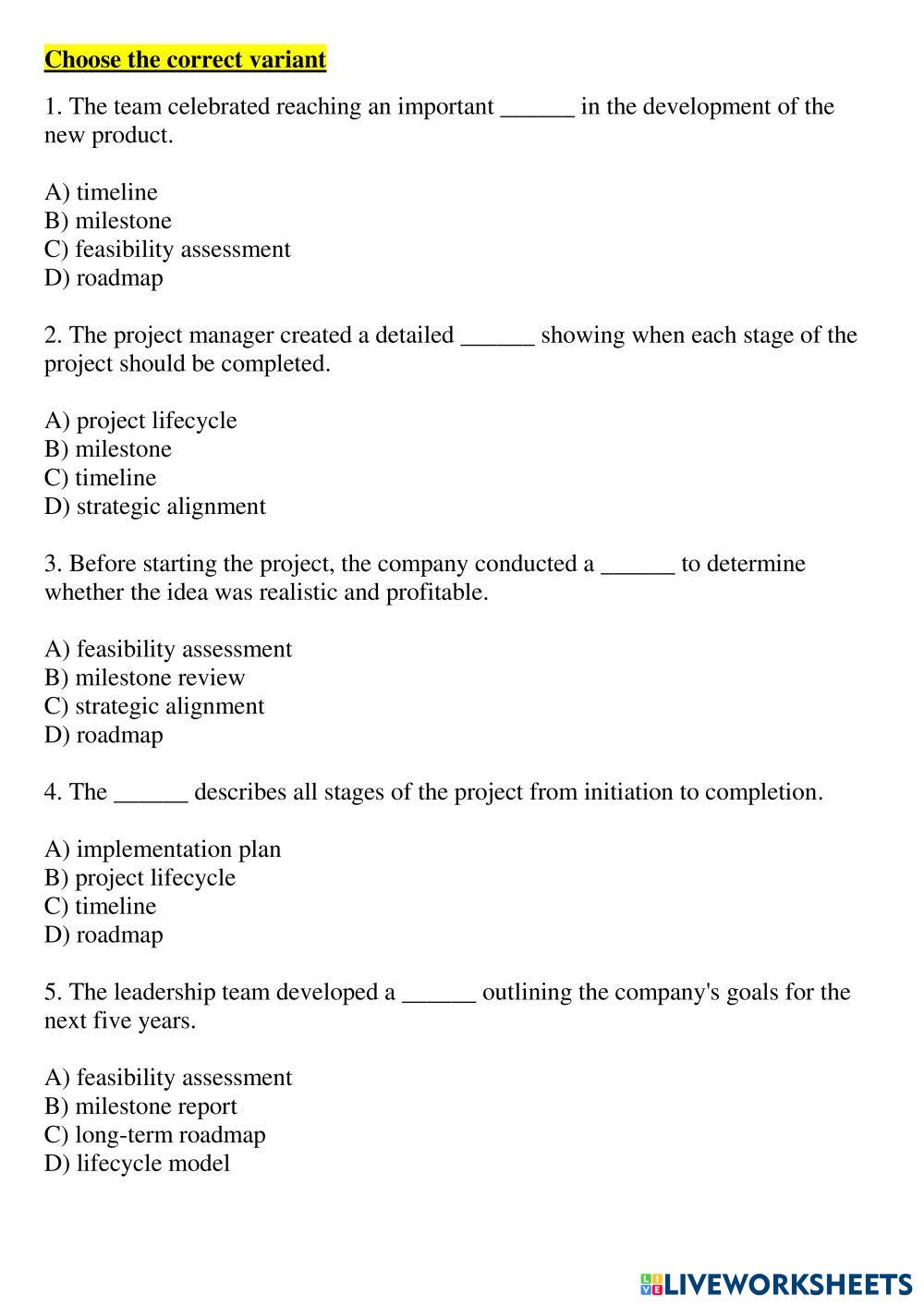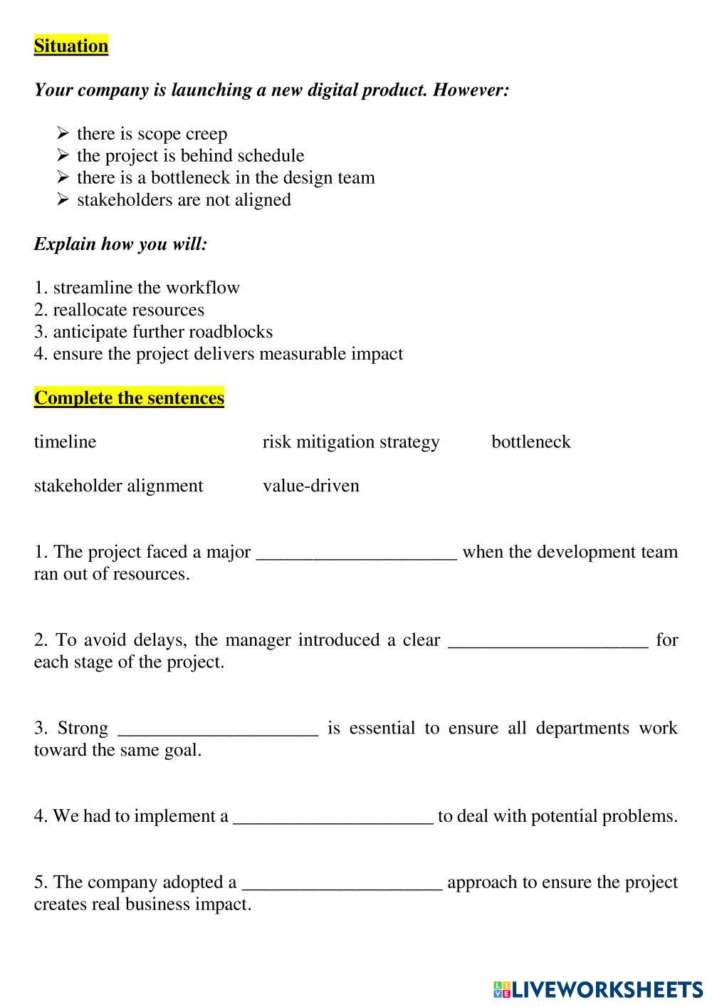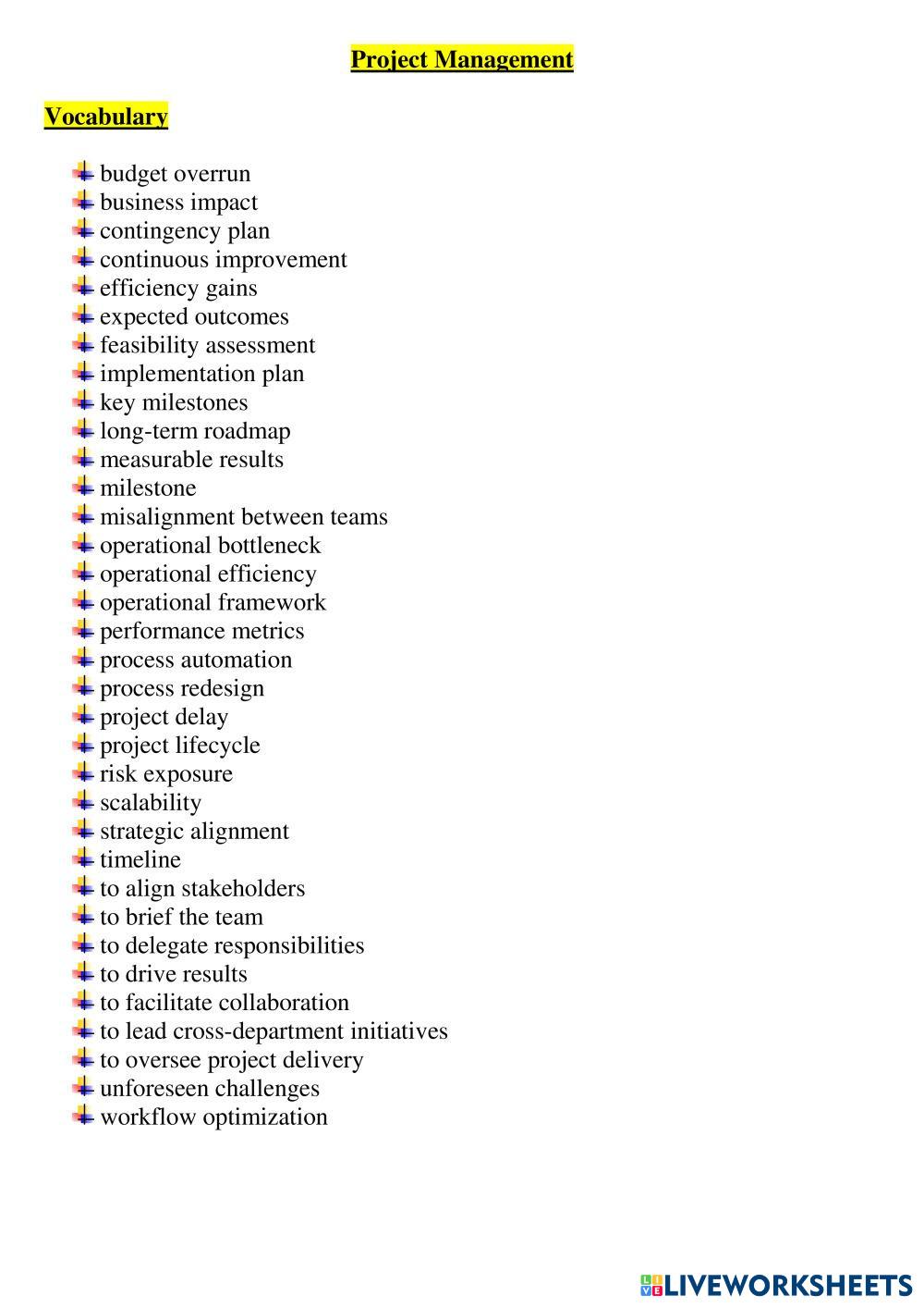 Created byViolet Arefieva ESL English C1 (Avanzado) Vocabulario English Instrucciones del autor Learn phrases and do tasks My Google Classroom Courses × 0 classes selected (0 students total) Quick Access Select all classes (0 classes) All Classes Loading courses... Cancelar Share Share to selected Course __COURSE_NAME__ __STUDENT_NAME__ (__STUDENT_EMAIL__) Project Management Descargar Worksheet Validation Comprobar mis respuestas Emails my answers to my teacher Nombre completo Group/level Asignatura Teacher's email or key code Close Submit Validating worksheet... (12) Your answers have been sent to your teacher. Good luck! OK We encountered an error submitting your answers. Please try again. OK Anuncio | Ir sin anuncios Created byViolet Arefieva ESL English C1 (Avanzado) Vocabulario English Instrucciones del autor Learn phrases and do tasks Explora las hojas de trabajo 25商本作业1 ESL C1 25商本作业1 Vocabulary - ESL Write the correct letter next to a word/phrase 25商本作业1 ESL C1 25商本作业1 Vocabulary - ESL Write the correct letter (definition) next to a word/phrase. Project Management & Job Interview Strategy (for Natasha) ESL C1 Project Management & Job Interview Strategy (for Natasha) Vocabulary - ESL Learn new vocabulary and do tasks Infinitive of Purpose ESL C1 Infinitive of Purpose Vocabulary - ESL choose the appropriate answer to complete the sentences below correctly.