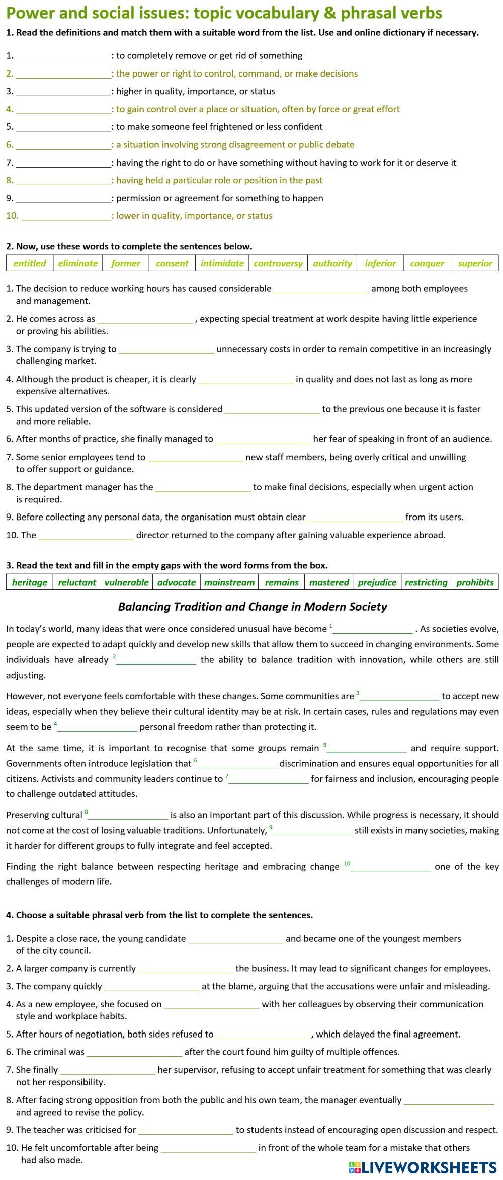 Created byArnis Poikāns ESL C1 (Avanzado) Vocabulario English Instrucciones del autor Vocabulary practice. My Google Classroom Courses × 0 classes selected (0 students total) Quick Access Select all classes (0 classes) All Classes Loading courses... Cancelar Share Share to selected Course __COURSE_NAME__ __STUDENT_NAME__ (__STUDENT_EMAIL__) Power and social issues: topic vocabulary & phrasal verbs Descargar Worksheet Validation Comprobar mis respuestas Emails my answers to my teacher Nombre completo Group/level Asignatura Teacher's email or key code Close Submit Validating worksheet... (12) Your answers have been sent to your teacher. Good luck! OK We encountered an error submitting your answers. Please try again. OK Anuncio | Ir sin anuncios Created byArnis Poikāns ESL C1 (Avanzado) Vocabulario English Instrucciones del autor Vocabulary practice. Explora las hojas de trabajo Project Management ESL C1 Project Management Vocabulary - ESL Learn phrases and do tasks 25商本作业1 ESL C1 25商本作业1 Vocabulary - ESL Write the correct letter next to a word/phrase 25商本作业1 ESL C1 25商本作业1 Vocabulary - ESL Write the correct letter (definition) next to a word/phrase. Project Management & Job Interview Strategy (for Natasha) ESL C1 Project Management & Job Interview Strategy (for Natasha) Vocabulary - ESL Learn new vocabulary and do tasks