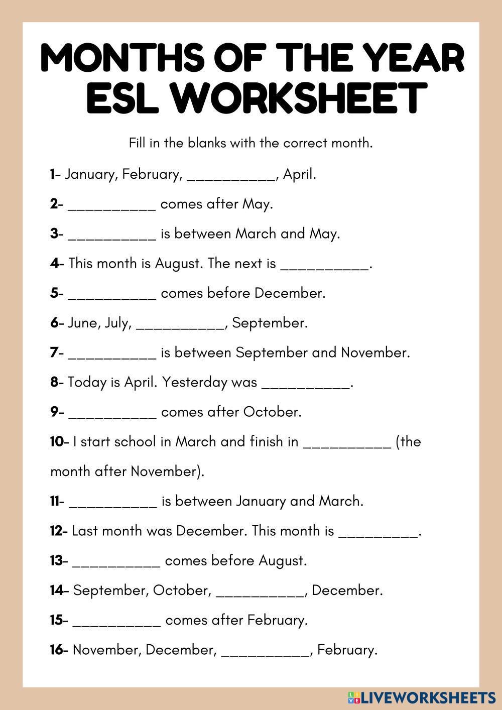 This ESL A1-level worksheet helps your younger students practice their knowledge of the months of the year in English.