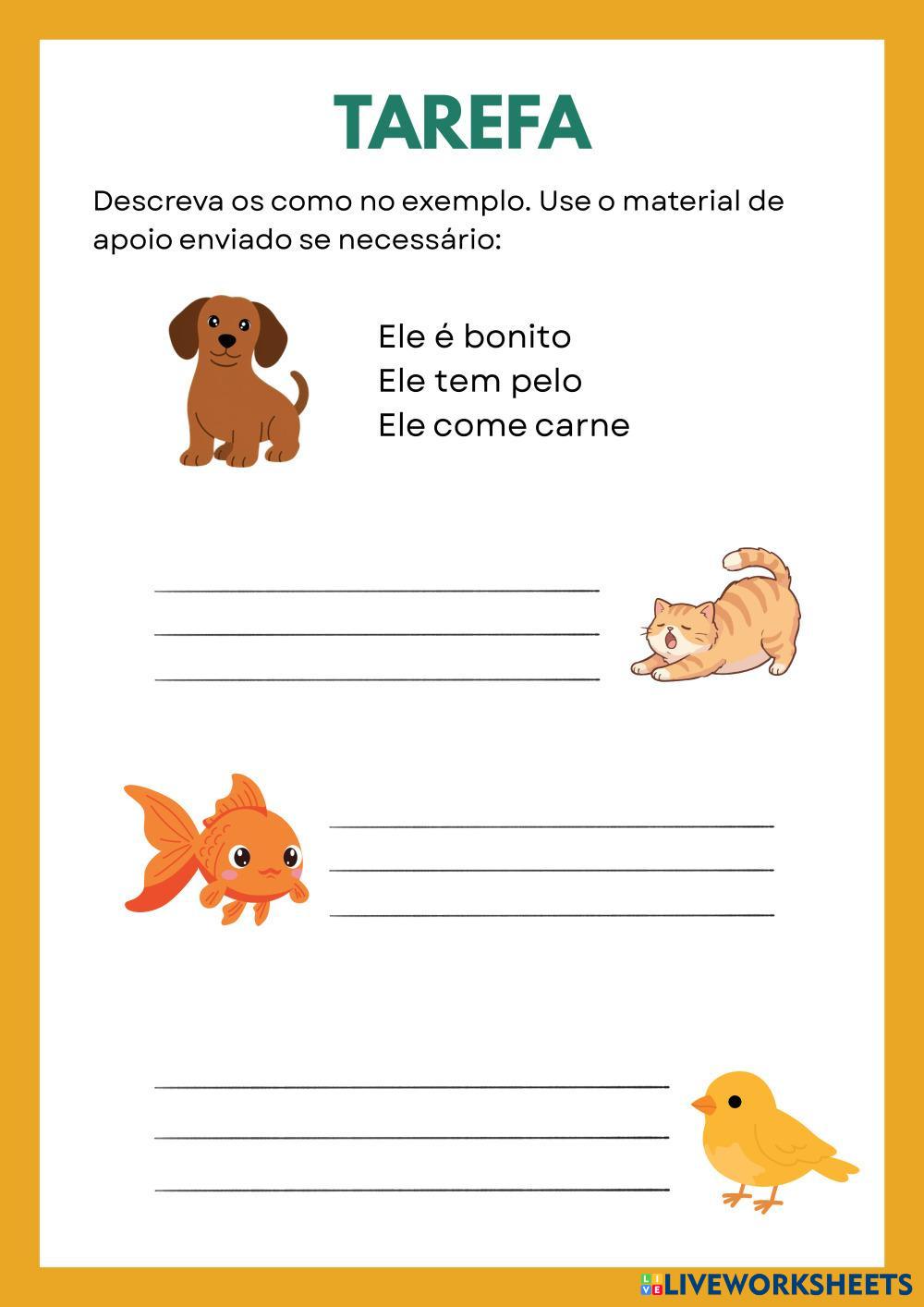 Created byAmanda F Machado ESL Portuguese, International A1 (Principiante) Escritura English Instrucciones del autor Siga as instruções na atividade My Google Classroom Courses × 0 classes selected (0 students total) Quick Access Select all classes (0 classes) All Classes Loading courses... Cancelar Share Share to selected Course __COURSE_NAME__ __STUDENT_NAME__ (__STUDENT_EMAIL__) Animais Descargar Worksheet Validation Comprobar mis respuestas Emails my answers to my teacher Nombre completo Group/level Asignatura Teacher's email or key code Close Submit Validating worksheet... (12) Your answers have been sent to your teacher. Good luck! OK We encountered an error submitting your answers. Please try again. OK Anuncio | Ir sin anuncios Created byAmanda F Machado ESL Portuguese, International A1 (Principiante) Escritura English Instrucciones del autor Siga as instruções na atividade Explora las hojas de trabajo class 3 portugues a2.5 ESL A1 class 3 portugues a2.5 Writing - ESL responde as perguntas de acordo com as indicações Polish ESL A1 Polish Writing - ESL polish