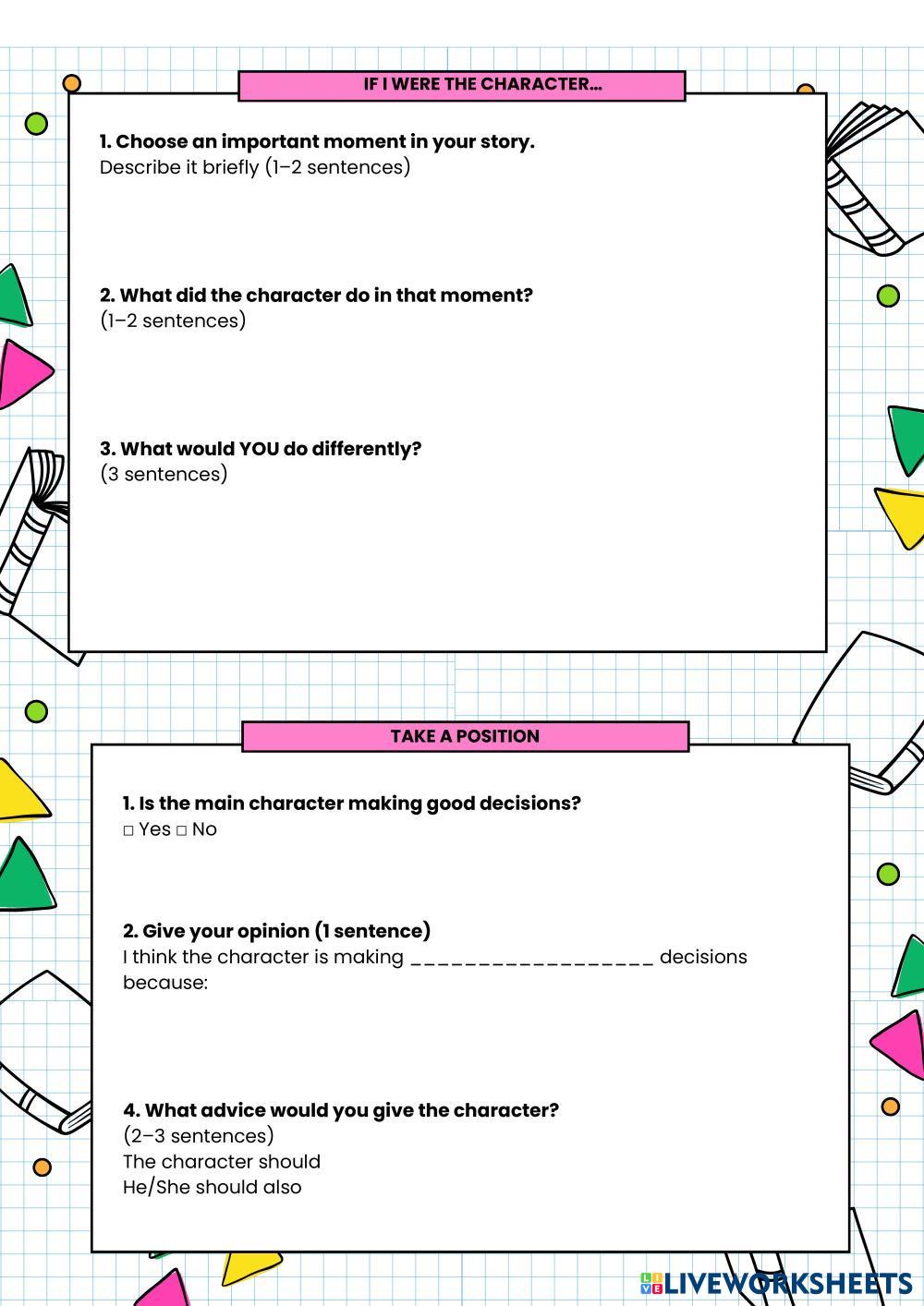 Created byCaroline Alcalá ESL English A2 (Básico) Escritura English Instrucciones del autor Complete the following worksheet taking into account the events you have read in your book My Google Classroom Courses × 0 classes selected (0 students total) Quick Access Select all classes (0 classes) All Classes Loading courses... Cancelar Share Share to selected Course __COURSE_NAME__ __STUDENT_NAME__ (__STUDENT_EMAIL__) Reading Plan Descargar Worksheet Validation Comprobar mis respuestas Emails my answers to my teacher Nombre completo Group/level Asignatura Teacher's email or key code Close Submit Validating worksheet... (12) Your answers have been sent to your teacher. Good luck! OK We encountered an error submitting your answers. Please try again. OK Anuncio | Ir sin anuncios Created byCaroline Alcalá ESL English A2 (Básico) Escritura English Instrucciones del autor Complete the following worksheet taking into account the events you have read in your book Explora las hojas de trabajo Basic Phrasal Verbs (with worksheet) ESL A2 Basic Phrasal Verbs (with worksheet) Writing - ESL Answer the questions about the basic phrasal verbs! TACN - Dược - On-going Test ESL A2 TACN - Dược - On-going Test Writing - ESL 6pts Open Up 6 Unit 4 Our Environment Review ESL A2 Open Up 6 Unit 4 Our Environment Review Writing - ESL Follow the instructions The Animals in English ESL A2 The Animals in English Writing - ESL de acuerdo al numero que corresponda el animal escribe su nombre