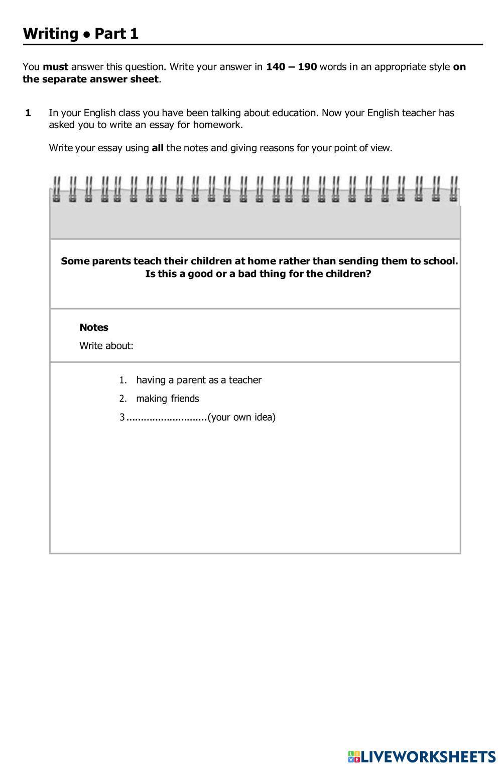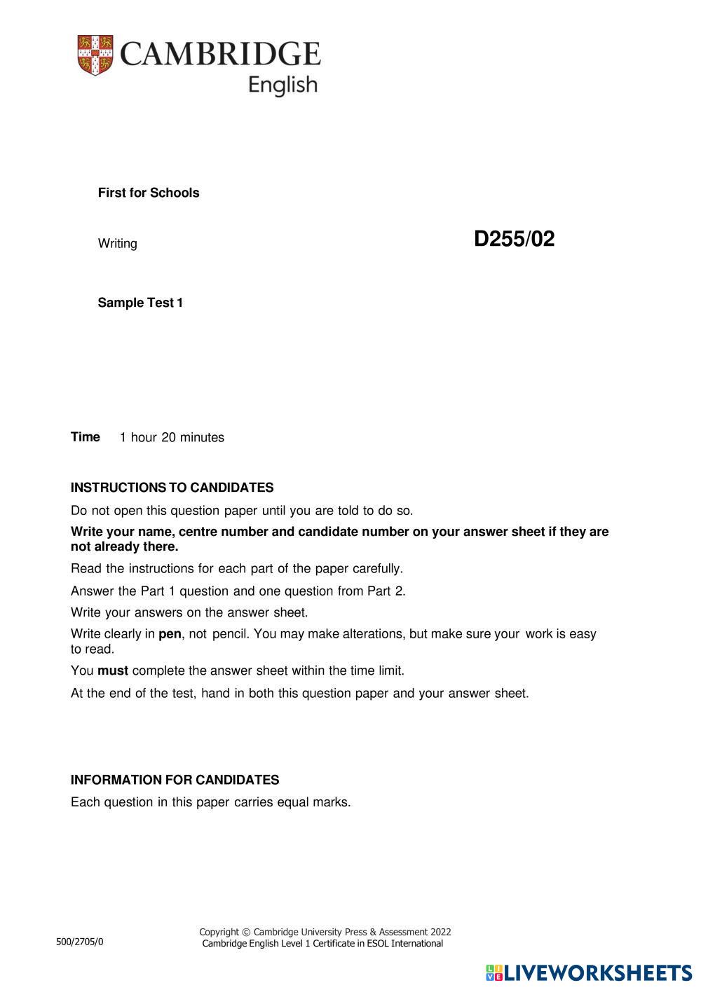 Created by Belle12 ESL English B2 (Intermedio Alto) Escritura English Instrucciones del autor Follow the instructions My Google Classroom Courses × 0 classes selected (0 students total) Quick Access Select all classes (0 classes) All Classes Loading courses... Cancelar Share Share to selected Course __COURSE_NAME__ __STUDENT_NAME__ (__STUDENT_EMAIL__) B2 First for Schools paper 1 Writing (2022) Descargar Worksheet Validation Comprobar mis respuestas Emails my answers to my teacher Nombre completo Group/level Asignatura Teacher's email or key code Close Submit Validating worksheet... (12) Your answers have been sent to your teacher. Good luck! OK We encountered an error submitting your answers. Please try again. OK Anuncio | Ir sin anuncios Created by Belle12 ESL English B2 (Intermedio Alto) Escritura English Instrucciones del autor Follow the instructions Explora las hojas de trabajo 21st Century Community B ESL B2 21st Century Community B Writing - ESL Please answer the following questions. TA9_GK2_Part4.3_Writing_Speaking ESL B2 TA9_GK2_Part4.3_Writing_Speaking Writing - ESL . TA9_GK2_Part4.2_Writing_Speaking ESL B2 TA9_GK2_Part4.2_Writing_Speaking Writing - ESL . Character Analysis ESL B2 Character Analysis Writing - ESL Fill in all sections