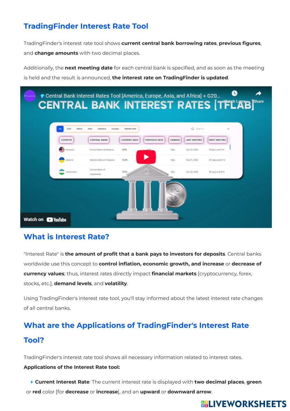 TradingFinder's interest rate tool shows current central bank borrowing rates, previous figures, and change amounts with two decimal places.