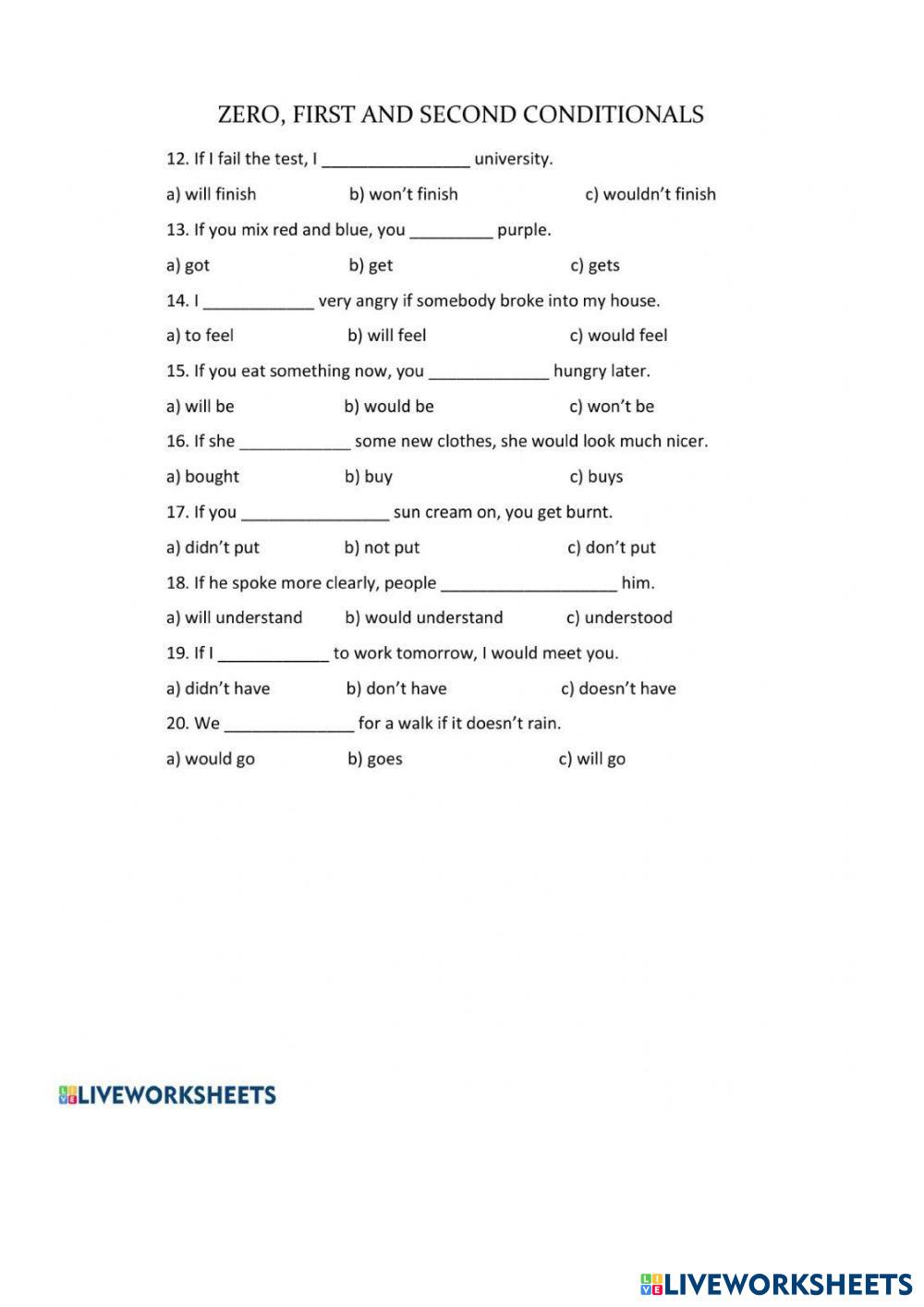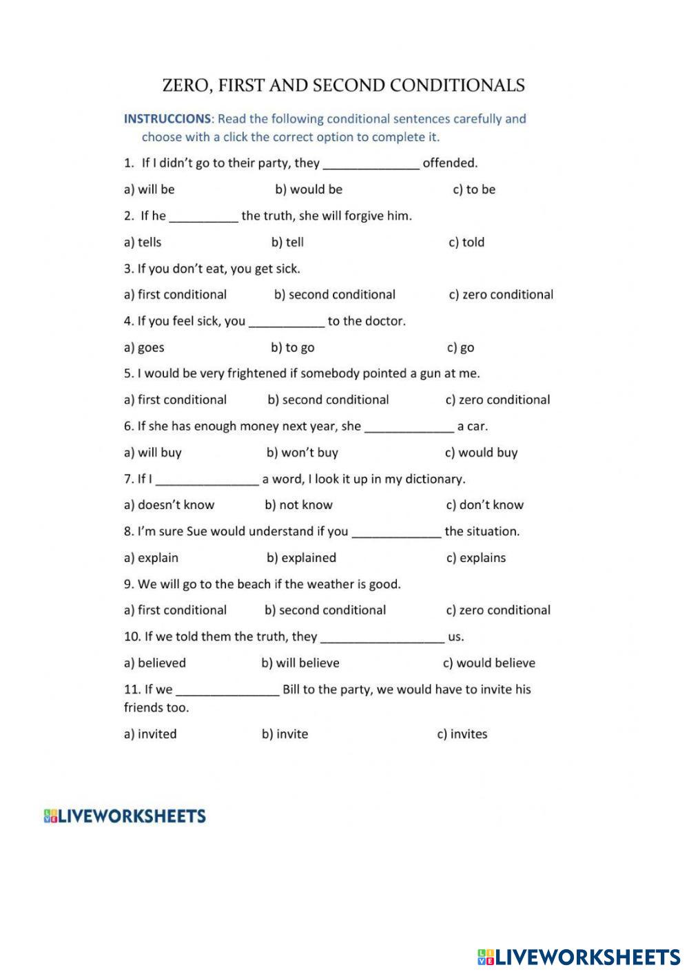 Created byHoa Le Kim ge Conditionals Edad 18+ level: B2 English Instrucciones del autor My Google Classroom Courses × 0 classes selected (0 students total) Quick Access Select all classes (0 classes) All Classes Loading courses... Cancelar Share Share to selected Course __COURSE_NAME__ __STUDENT_NAME__ (__STUDENT_EMAIL__) Conditionals Descargar Worksheet Validation Comprobar mis respuestas Emails my answers to my teacher Nombre completo Group/level Asignatura Teacher's email or key code Close Submit Validating worksheet... (12) Your answers have been sent to your teacher. Good luck! OK We encountered an error submitting your answers. Please try again. OK Anuncio | Ir sin anuncios Created byHoa Le Kim ge Conditionals Edad 18+ level: B2 English Instrucciones del autor