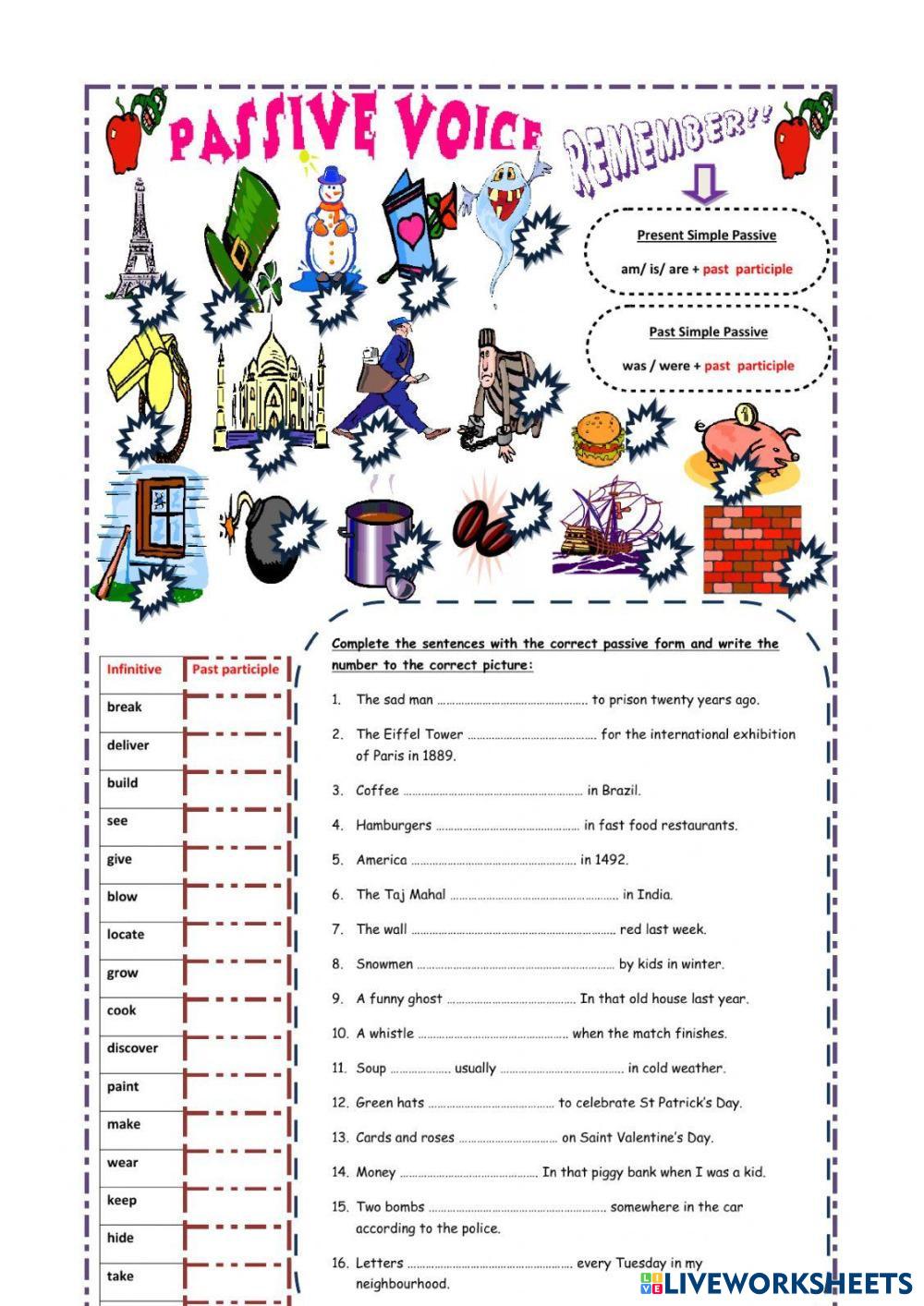 Created byHoa Le Kim ge passive voice Edad 18+ level: B2 English Instrucciones del autor My Google Classroom Courses × 0 classes selected (0 students total) Quick Access Select all classes (0 classes) All Classes Loading courses... Cancelar Share Share to selected Course __COURSE_NAME__ __STUDENT_NAME__ (__STUDENT_EMAIL__) Passive Voice Descargar Worksheet Validation Comprobar mis respuestas Emails my answers to my teacher Nombre completo Group/level Asignatura Teacher's email or key code Close Submit Validating worksheet... (12) Your answers have been sent to your teacher. Good luck! OK We encountered an error submitting your answers. Please try again. OK Anuncio | Ir sin anuncios Created byHoa Le Kim ge passive voice Edad 18+ level: B2 English Instrucciones del autor