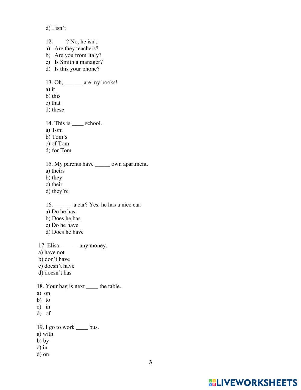 Created by Nader2022 General English Placement Test Edad 17+ level: 1A English Author's Instructions My Google Classroom Courses × 0 classes selected (0 students total) Quick Access Select all classes (0 classes) All Classes Loading courses... Cancelar Share Share to selected Course __COURSE_NAME__ __STUDENT_NAME__ (__STUDENT_EMAIL__) placement Test Download Worksheet Validation Comprobar mis respuestas Emails my answers to my teacher Nombre completo Group/level Asignatura Teacher's email or key code Close Submit Validating worksheet... (12) Your answers have been sent to your teacher. Good luck! OK We encountered an error submitting your answers. Please try again. OK Anuncio | Ir sin anuncios Created by Nader2022 General English Placement Test Edad 17+ level: 1A English Author's Instructions