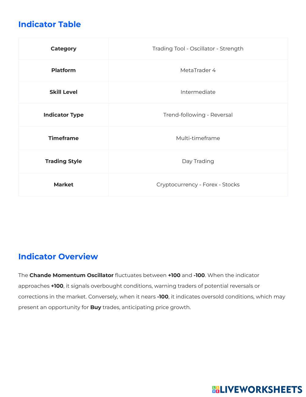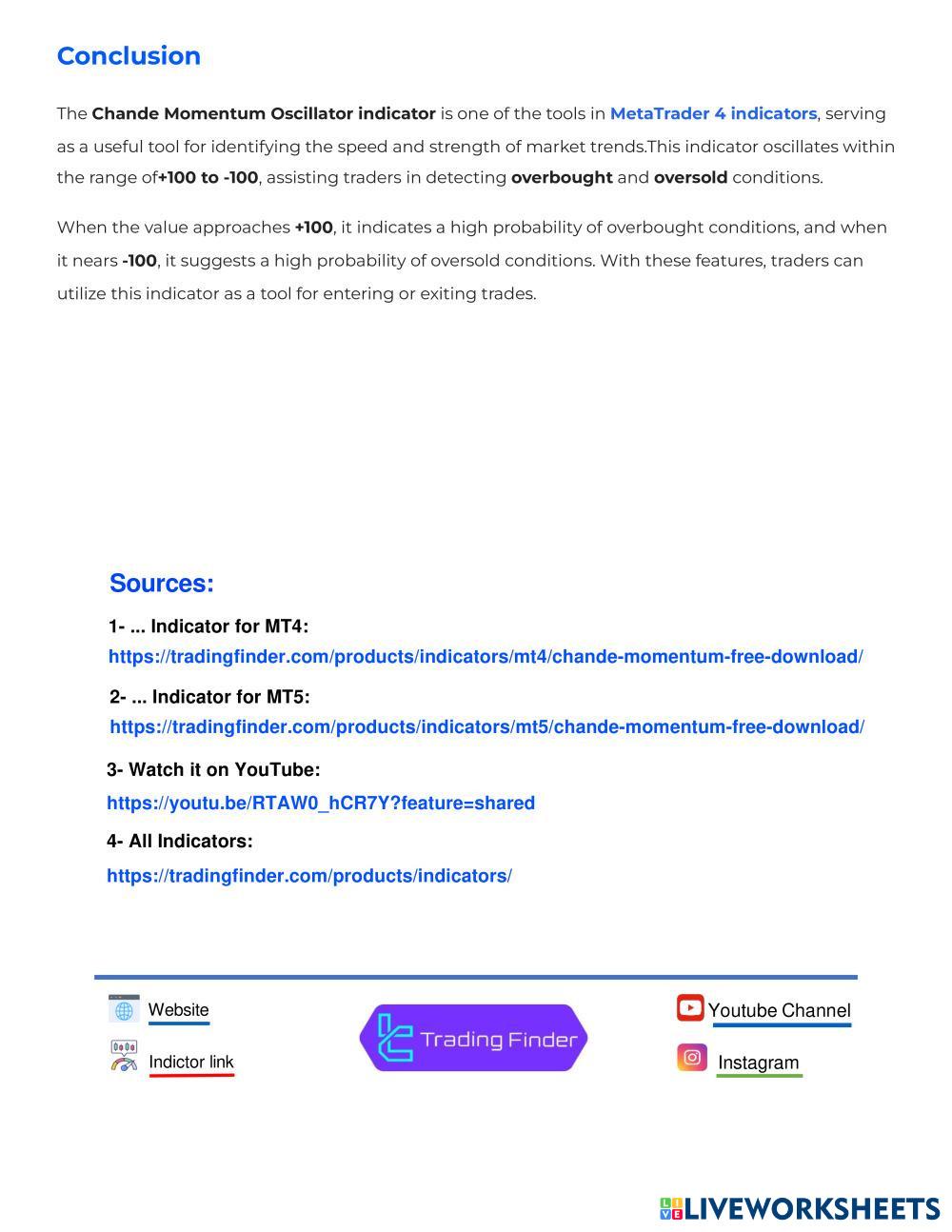 The Chande Momentum Oscillator indicator, similar to other oscillators such as the RSI indicator and MACD, helps identify overbought and oversold conditions in MetaTrader 4.