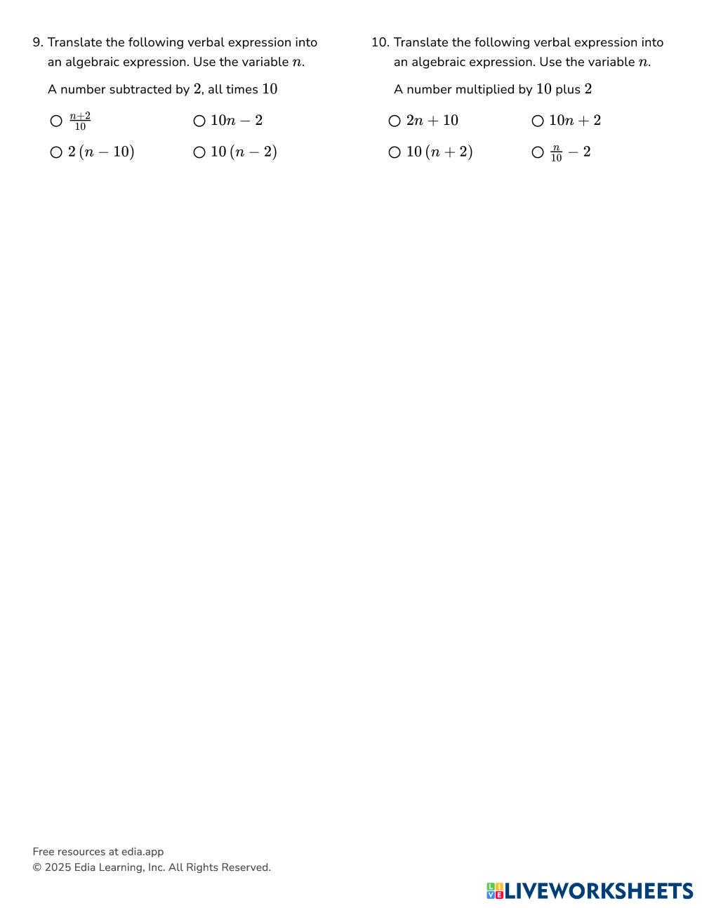 Translate the following verbal expression into an algebraic expression. Use the variable n .