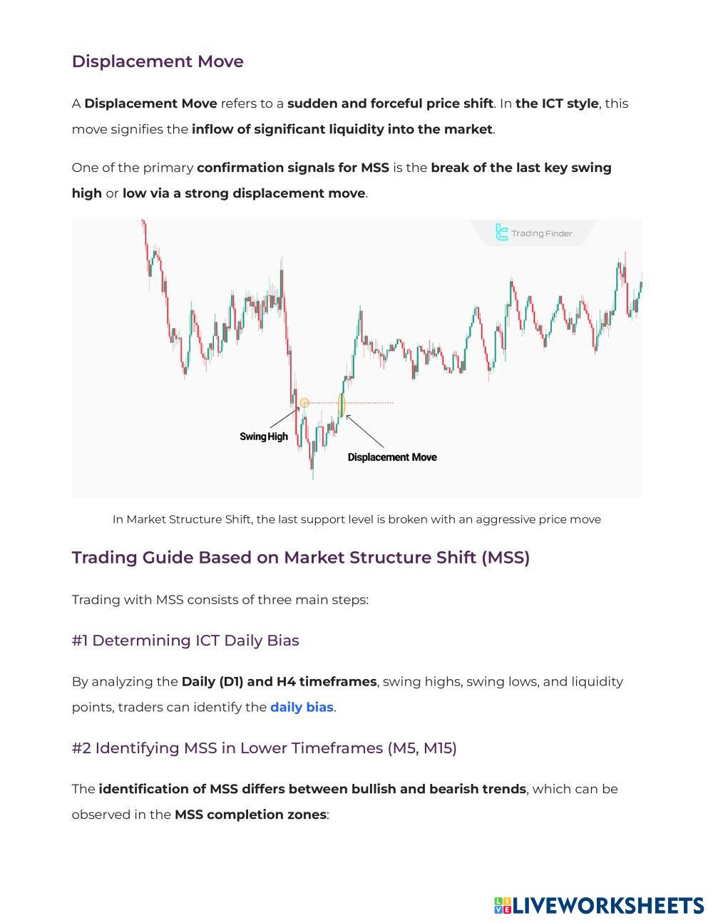 The Market Structure Shift (MSS) in ICT style signifies initial price movements that can lead to a trend reversal or a change in market direction.