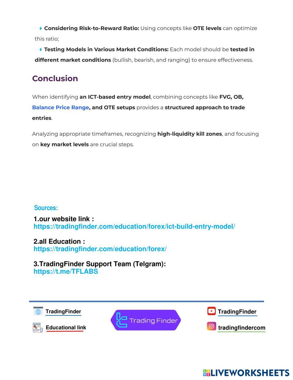 To design an entry model using ICT concepts, the primary focus is on shorter timeframes and entry tools, including Fair Value Gap (FVG), Order Blocks, Balance Price Range (BPR), and Optimal Trade Entry (OTE).