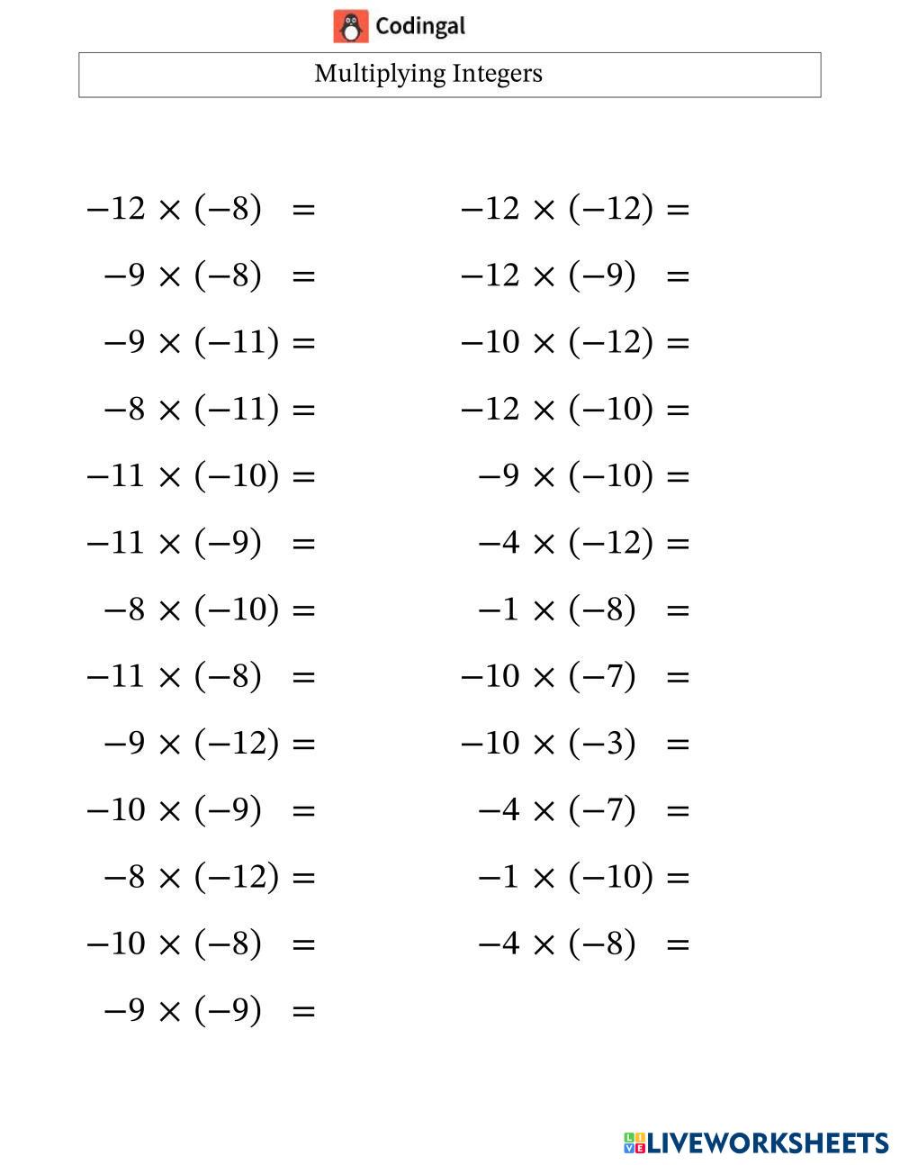 Created byKalaivani Sivan MATHEMATICS multiplication integers Edad 7-18 level: LEVEL 1 English Instrucciones del autor My Google Classroom Courses × 0 classes selected (0 students total) Quick Access Select all classes (0 classes) All Classes Loading courses... Cancelar Share Share to selected Course __COURSE_NAME__ __STUDENT_NAME__ (__STUDENT_EMAIL__) CODINGAL Descargar Worksheet Validation Comprobar mis respuestas Emails my answers to my teacher Nombre completo Group/level Asignatura Teacher's email or key code Close Submit Validating worksheet... (12) Your answers have been sent to your teacher. Good luck! OK We encountered an error submitting your answers. Please try again. OK Anuncio | Ir sin anuncios Created byKalaivani Sivan MATHEMATICS multiplication integers Edad 7-18 level: LEVEL 1 English Instrucciones del autor