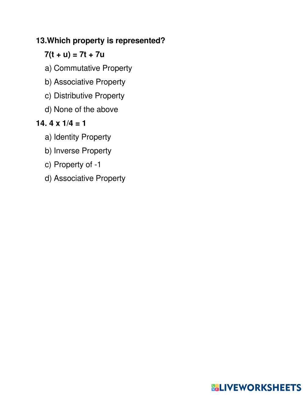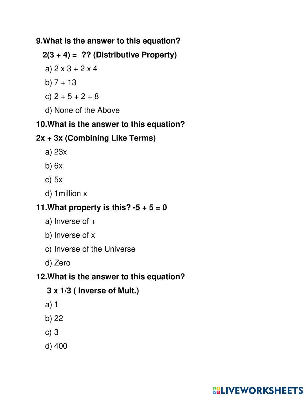 Created byKalaivani Sivan MATHEMATICS PROPERTIES OF INTEGER MULTIPLICATION Edad 7-18 level: LEVEL 1 English Instrucciones del autor My Google Classroom Courses × 0 classes selected (0 students total) Quick Access Select all classes (0 classes) All Classes Loading courses... Cancelar Share Share to selected Course __COURSE_NAME__ __STUDENT_NAME__ (__STUDENT_EMAIL__) CODINGAL Descargar Worksheet Validation Comprobar mis respuestas Emails my answers to my teacher Nombre completo Group/level Asignatura Teacher's email or key code Close Submit Validating worksheet... (12) Your answers have been sent to your teacher. Good luck! OK We encountered an error submitting your answers. Please try again. OK Anuncio | Ir sin anuncios Created byKalaivani Sivan MATHEMATICS PROPERTIES OF INTEGER MULTIPLICATION Edad 7-18 level: LEVEL 1 English Instrucciones del autor
