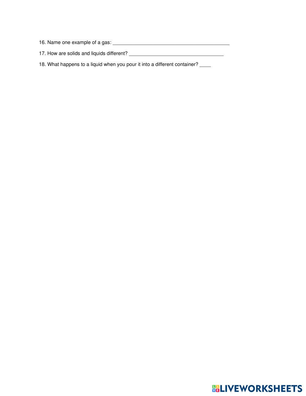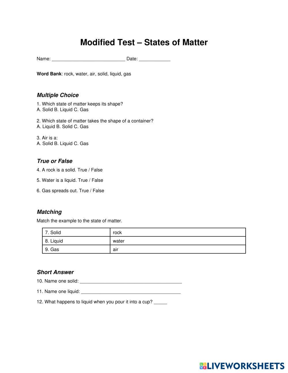Multiple Choice (Circle the correct answer) 1. Which state of matter keeps its shape? A. Liquid B. Gas C. Solid D. Air 2. Which state of matter takes the shape of its container? A. Solid B. Liquid C. Rock D. Ice 3. What state of matter is air? A. Solid B. Liquid C. Gas D. Ice 4. Which of these is a liquid? A. Water B. Rock C. Chair D. Pencil 5. Which of these is a solid? A. Milk B. Water C. Apple D. Juice True or False 6. Liquids keep the same shape no matter what container they are in. True / False 7. Solids have their own shape. True / False 8. Gas spreads out and fills the space around it. True / False 9. Water is a liquid. True / False 10. A rock is a gas. True / False Matching Match the state of matter with the description. 11. Solid A. Has no shape and spreads out 12. Liquid B. Has its own shape 13. Gas C. Takes the shape of its container Short Answer 14. Name one example of a solid: ________________________________________ 15. Name one example of a liquid: ________________________________________ 16. Name one example of a gas: __________________________________________ 17. How are solids and liquids different? __________________________________ 18. What happens to a liquid when you pour it into a different container? ____