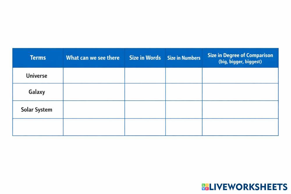 Read the table carefully.Answers into the appropriate boxes to complete the table about the Universe, Galaxy, and Solar System. Use the choices provided. Make sure each description, size, and example matches the correct term.