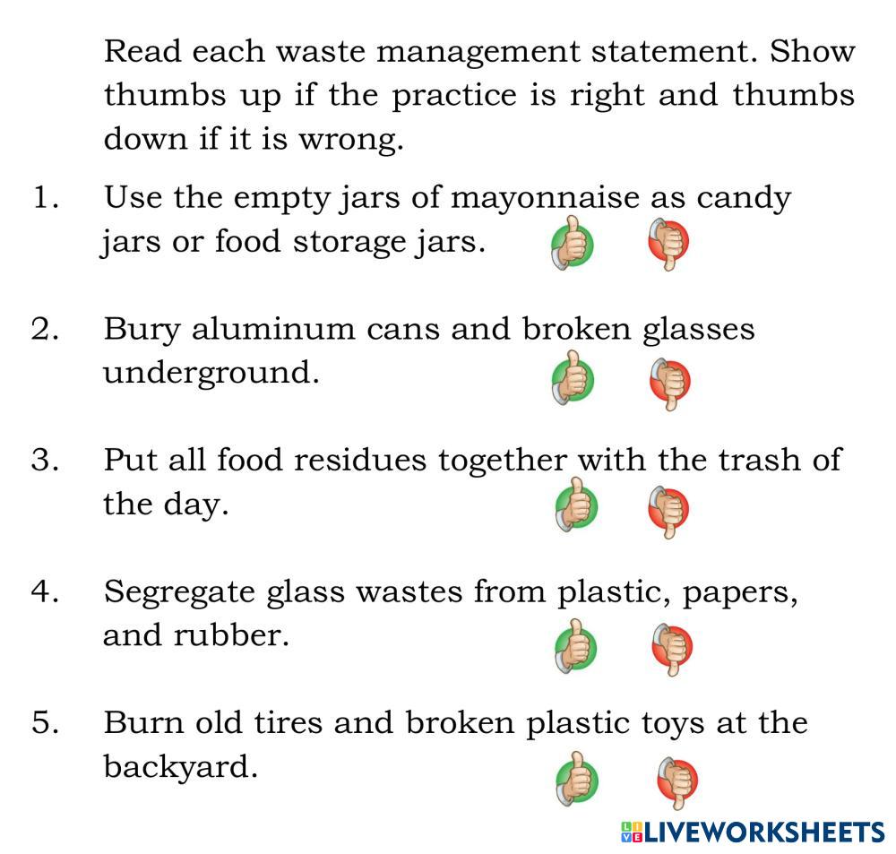 Created bySHARYN G. INDING Science 5 R's of Waste Management Edad 8-9 level: GRADE 5 English Instrucciones del autor WASTE MANAGEMENT My Google Classroom Courses × 0 classes selected (0 students total) Quick Access Select all classes (0 classes) All Classes Loading courses... Cancelar Share Share to selected Course __COURSE_NAME__ __STUDENT_NAME__ (__STUDENT_EMAIL__) 5Rs TECHNIQUE Descargar Worksheet Validation Comprobar mis respuestas Emails my answers to my teacher Nombre completo Group/level Asignatura Teacher's email or key code Close Submit Validating worksheet... (12) Your answers have been sent to your teacher. Good luck! OK We encountered an error submitting your answers. Please try again. OK Anuncio | Ir sin anuncios Created bySHARYN G. INDING Science 5 R's of Waste Management Edad 8-9 level: GRADE 5 English Instrucciones del autor WASTE MANAGEMENT