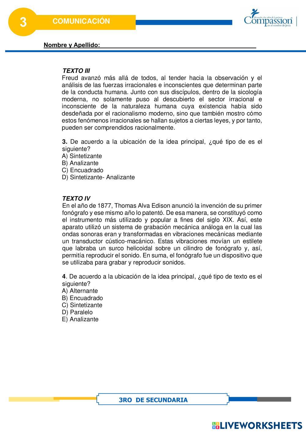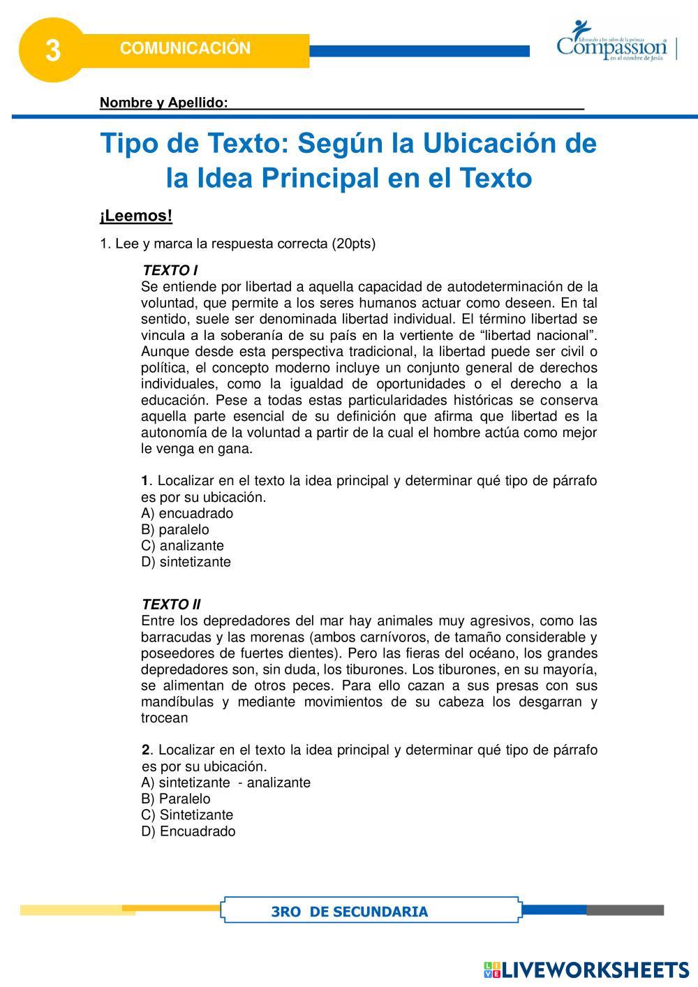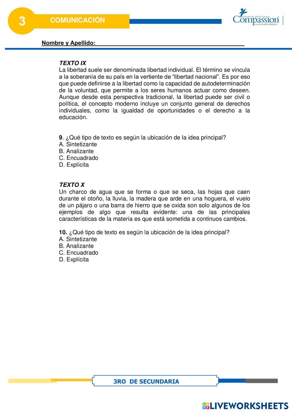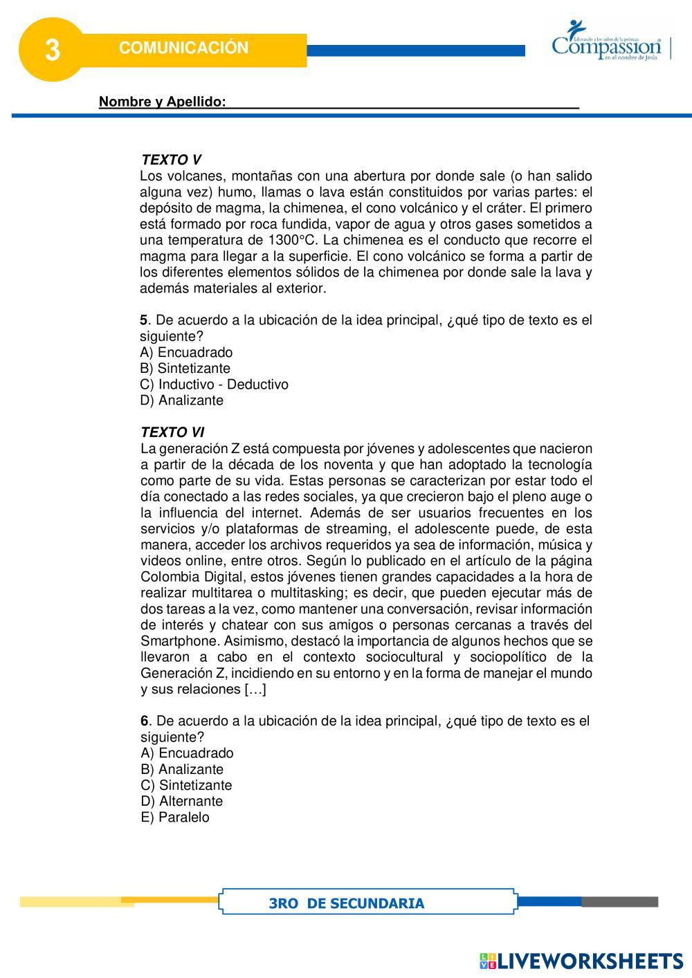 Created byCompassion international del Perú Comunicación Tipo de texto según la ubicación de la idea principal Edad 14+ level: 3ro Secundaria Spanish Instrucciones del autor My Google Classroom Courses × 0 classes selected (0 students total) Quick Access Select all classes (0 classes) All Classes Loading courses... Cancelar Share Share to selected Course __COURSE_NAME__ __STUDENT_NAME__ (__STUDENT_EMAIL__) Tipo de texto según la ubicación de la idea principal Descargar Worksheet Validation Comprobar mis respuestas Emails my answers to my teacher Nombre completo Group/level Asignatura Teacher's email or key code Close Submit Validating worksheet... (12) Your answers have been sent to your teacher. Good luck! OK We encountered an error submitting your answers. Please try again. OK Anuncio | Ir sin anuncios Created byCompassion international del Perú Comunicación Tipo de texto según la ubicación de la idea principal Edad 14+ level: 3ro Secundaria Spanish Instrucciones del autor