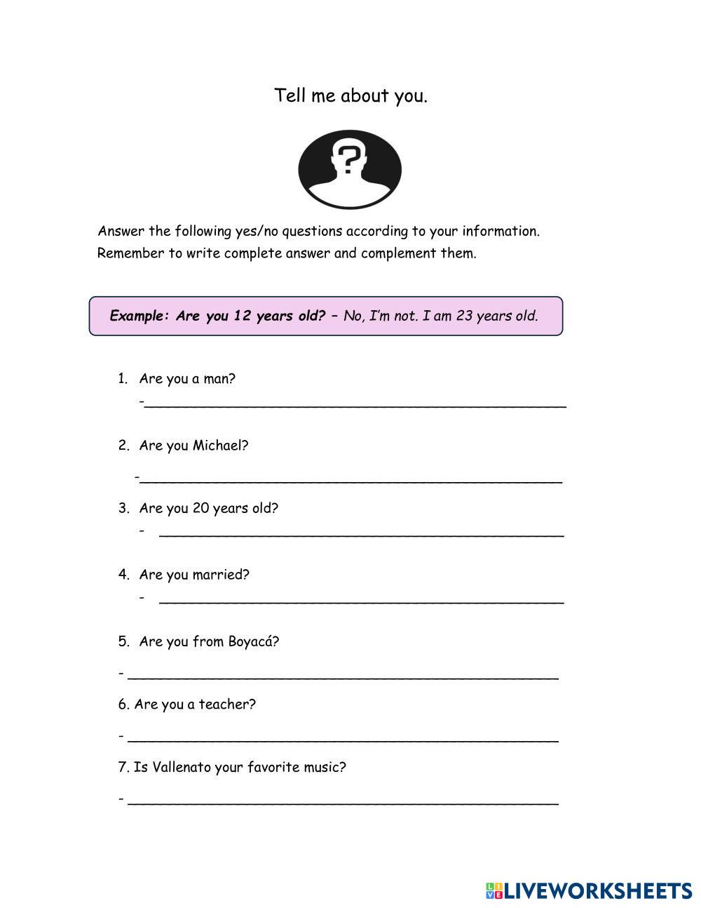Created byYiset Valentina Sánchez Higuera English as a Second Language (ESL) Yes or no questions with be Edad 10+ level: A1 Spanish Instrucciones del autor My Google Classroom Courses × 0 classes selected (0 students total) Quick Access Select all classes (0 classes) All Classes Loading courses... Cancelar Share Share to selected Course __COURSE_NAME__ __STUDENT_NAME__ (__STUDENT_EMAIL__) Yes or No questions with be Descargar Worksheet Validation Comprobar mis respuestas Emails my answers to my teacher Nombre completo Group/level Asignatura Teacher's email or key code Close Submit Validating worksheet... (12) Your answers have been sent to your teacher. Good luck! OK We encountered an error submitting your answers. Please try again. OK Anuncio | Ir sin anuncios Created byYiset Valentina Sánchez Higuera English as a Second Language (ESL) Yes or no questions with be Edad 10+ level: A1 Spanish Instrucciones del autor