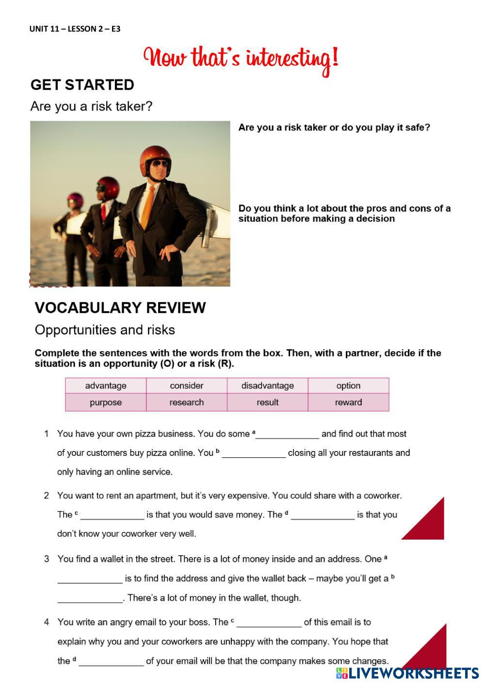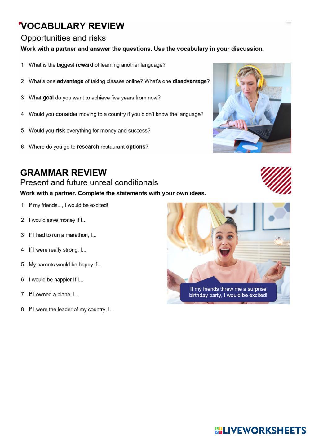 Created by Lizes English Talk about imaginary situations Edad 18+ level: B1 Spanish Instrucciones del autor My Google Classroom Courses × 0 classes selected (0 students total) Quick Access Select all classes (0 classes) All Classes Loading courses... Cancelar Share Share to selected Course __COURSE_NAME__ __STUDENT_NAME__ (__STUDENT_EMAIL__) Lesson 2 - Unit 11 - E3 Descargar Worksheet Validation Comprobar mis respuestas Emails my answers to my teacher Nombre completo Group/level Asignatura Teacher's email or key code Close Submit Validating worksheet... (12) Your answers have been sent to your teacher. Good luck! OK We encountered an error submitting your answers. Please try again. OK Anuncio | Ir sin anuncios Created by Lizes English Talk about imaginary situations Edad 18+ level: B1 Spanish Instrucciones del autor