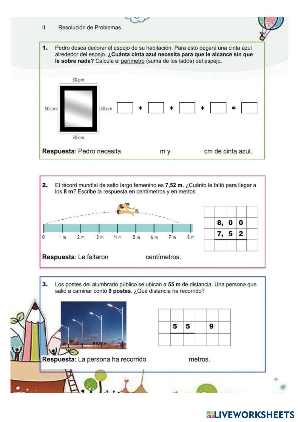 Resuelve los ejercicios calculando y recordando metros y centímetros