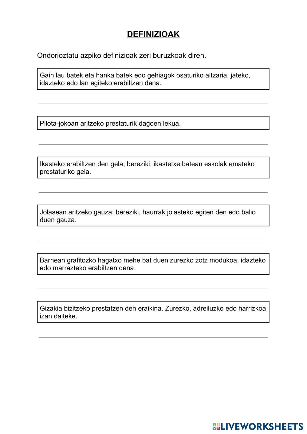 Created by ikerpa Lengua vasca DEFINIZIOAK / ULERMENA Edad 7-15 level: LEHEN HEZKUNTZA Basque Instrucciones del autor My Google Classroom Courses × 0 classes selected (0 students total) Quick Access Select all classes (0 classes) All Classes Loading courses... Cancelar Share Share to selected Course __COURSE_NAME__ __STUDENT_NAME__ (__STUDENT_EMAIL__) DEFINIZIO ADIBIDEAK Descargar Worksheet Validation Comprobar mis respuestas Emails my answers to my teacher Nombre completo Group/level Asignatura Teacher's email or key code Close Submit Validating worksheet... (12) Your answers have been sent to your teacher. Good luck! OK We encountered an error submitting your answers. Please try again. OK Anuncio | Ir sin anuncios Created by ikerpa Lengua vasca DEFINIZIOAK / ULERMENA Edad 7-15 level: LEHEN HEZKUNTZA Basque Instrucciones del autor