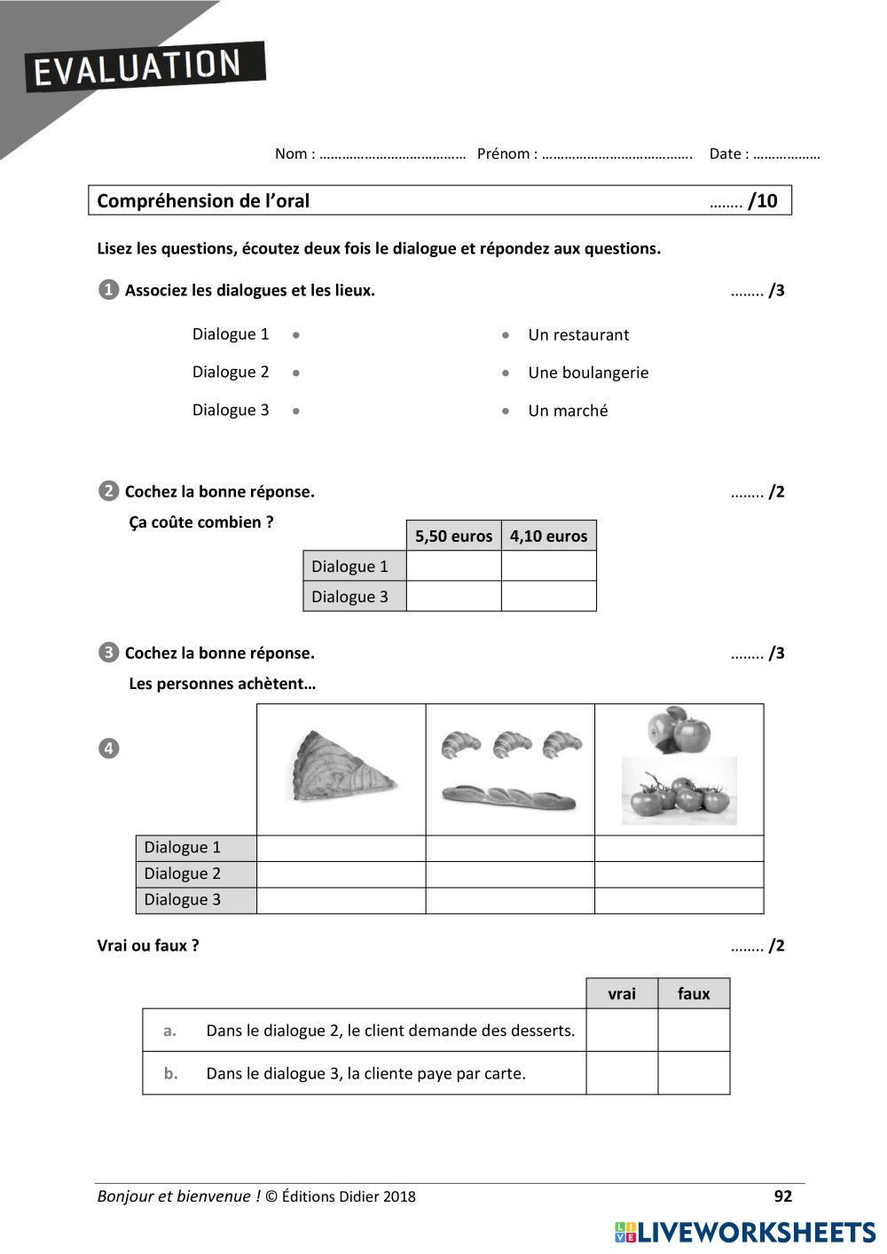 Obtenu du livre Bonjour et Bienvenue A1.1, Éditions Didier 2018