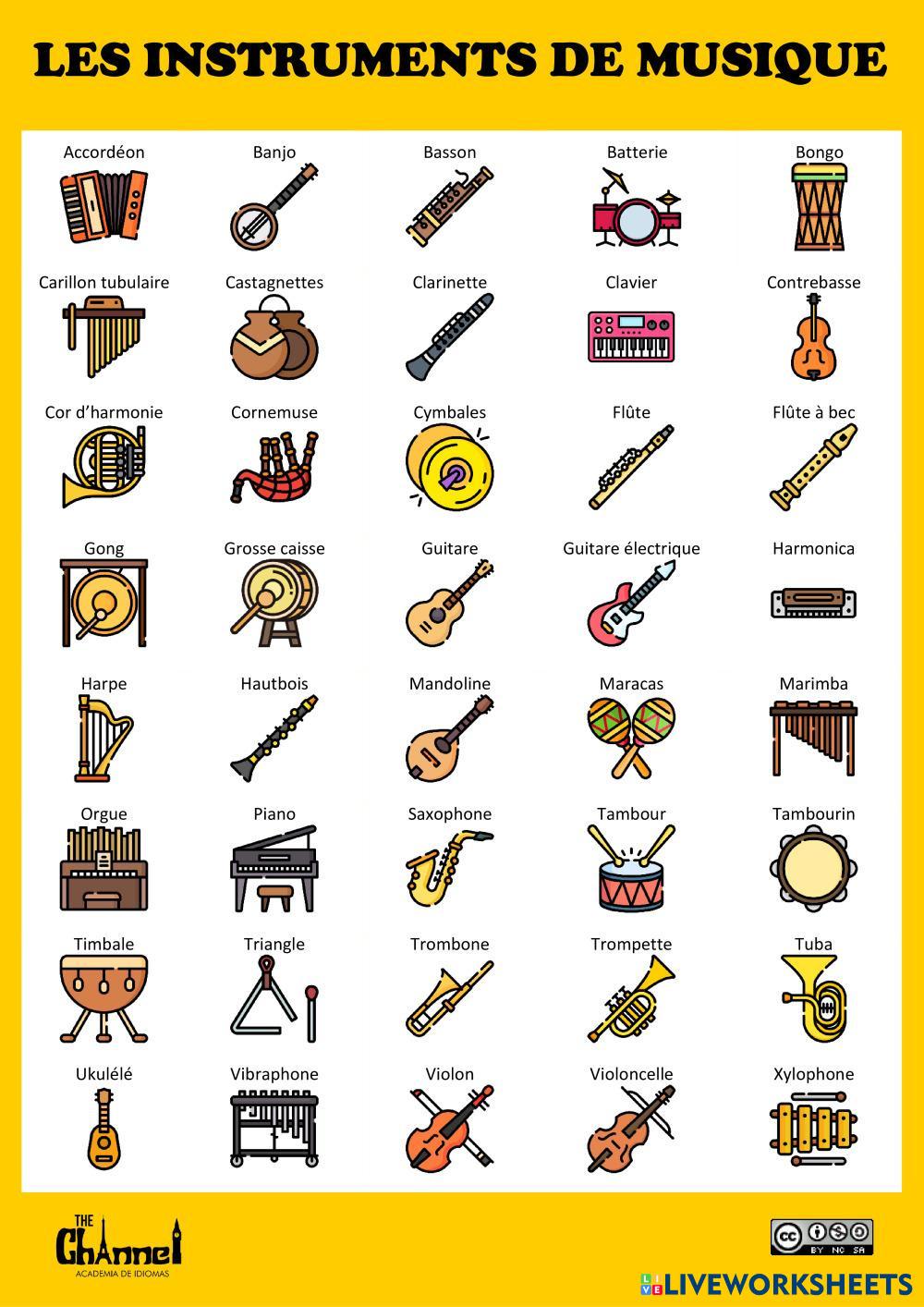 Created byThe Channel - Academia de idiomas Français Langue Étrangère (FLE) Les instruments de musique Edad 6-16 level: A1 French Instrucciones del autor Dictionnaire visuel avec 40 instruments de musique. My Google Classroom Courses × 0 classes selected (0 students total) Quick Access Select all classes (0 classes) All Classes Loading courses... Cancelar Share Share to selected Course __COURSE_NAME__ __STUDENT_NAME__ (__STUDENT_EMAIL__) LES INSTRUMENTS DE MUSIQUE (40 mots) Descargar Worksheet Validation Comprobar mis respuestas Emails my answers to my teacher Nombre completo Group/level Asignatura Teacher's email or key code Close Submit Validating worksheet... (12) Your answers have been sent to your teacher. Good luck! OK We encountered an error submitting your answers. Please try again. OK Anuncio | Ir sin anuncios Created byThe Channel - Academia de idiomas Français Langue Étrangère (FLE) Les instruments de musique Edad 6-16 level: A1 French Instrucciones del autor Dictionnaire visuel avec 40 instruments de musique.
