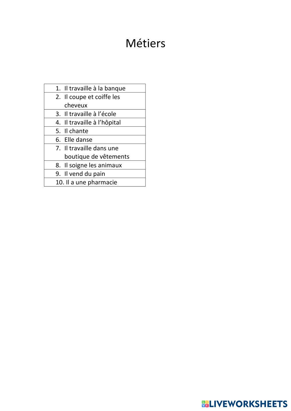 Created by npet Français Langue Étrangère (FLE) Les métiers - les professions Edad 10+ level: A1 French Instrucciones del autor My Google Classroom Courses × 0 classes selected (0 students total) Quick Access Select all classes (0 classes) All Classes Loading courses... Cancelar Share Share to selected Course __COURSE_NAME__ __STUDENT_NAME__ (__STUDENT_EMAIL__) Les métiers Descargar Worksheet Validation Comprobar mis respuestas Emails my answers to my teacher Nombre completo Group/level Asignatura Teacher's email or key code Close Submit Validating worksheet... (12) Your answers have been sent to your teacher. Good luck! OK We encountered an error submitting your answers. Please try again. OK Anuncio | Ir sin anuncios Created by npet Français Langue Étrangère (FLE) Les métiers - les professions Edad 10+ level: A1 French Instrucciones del autor