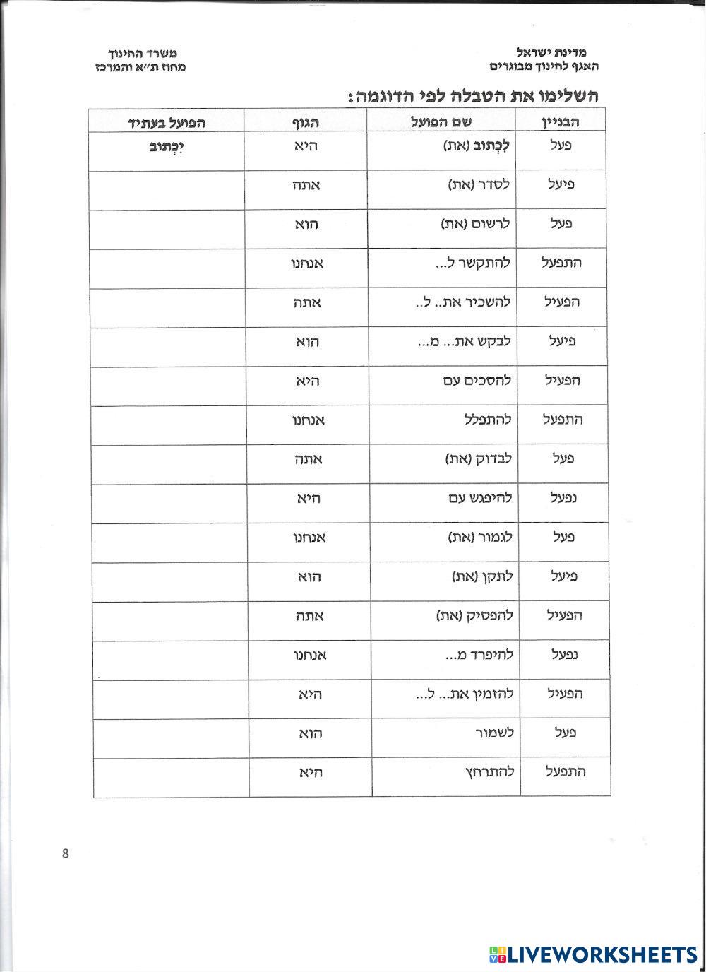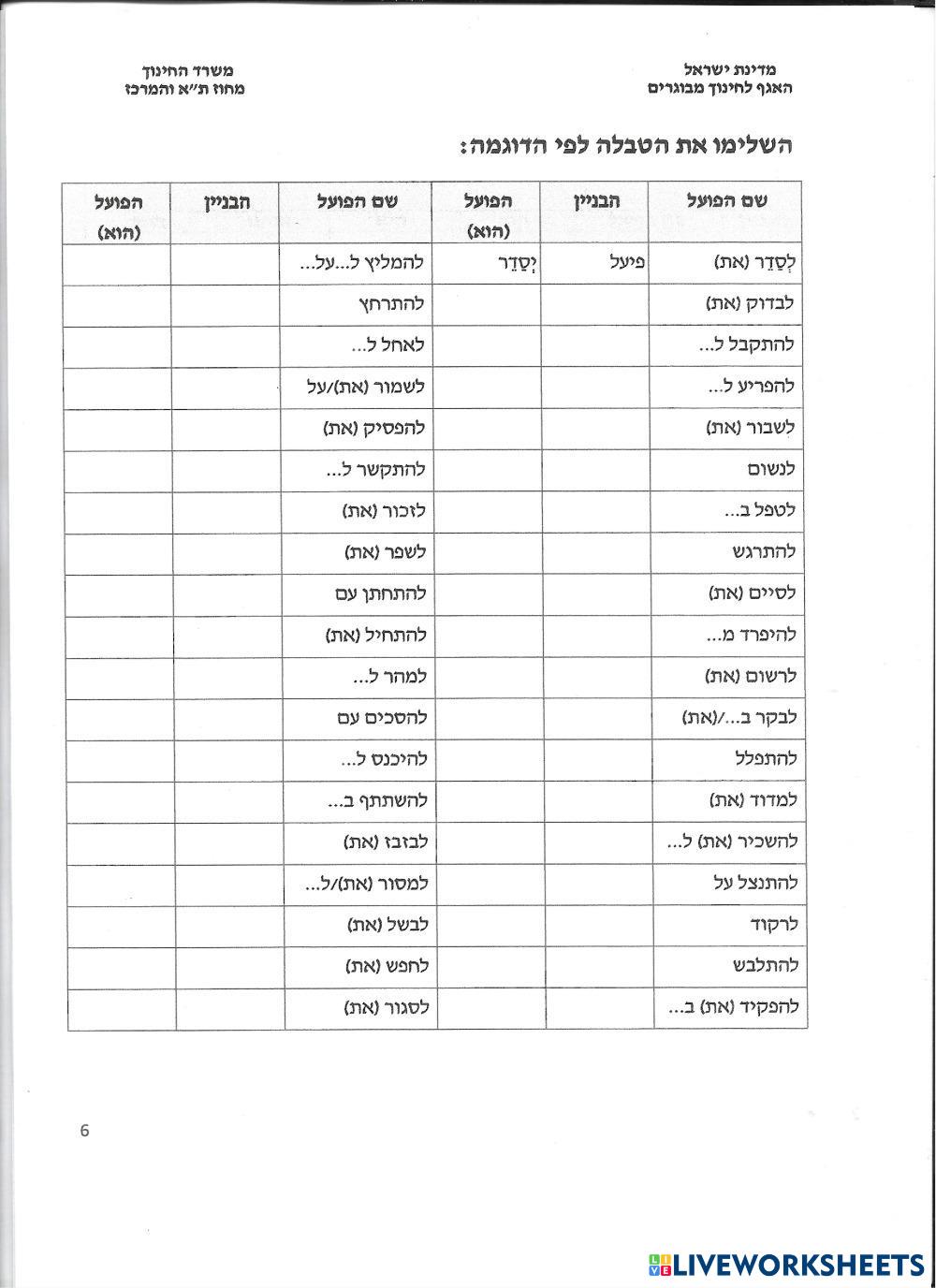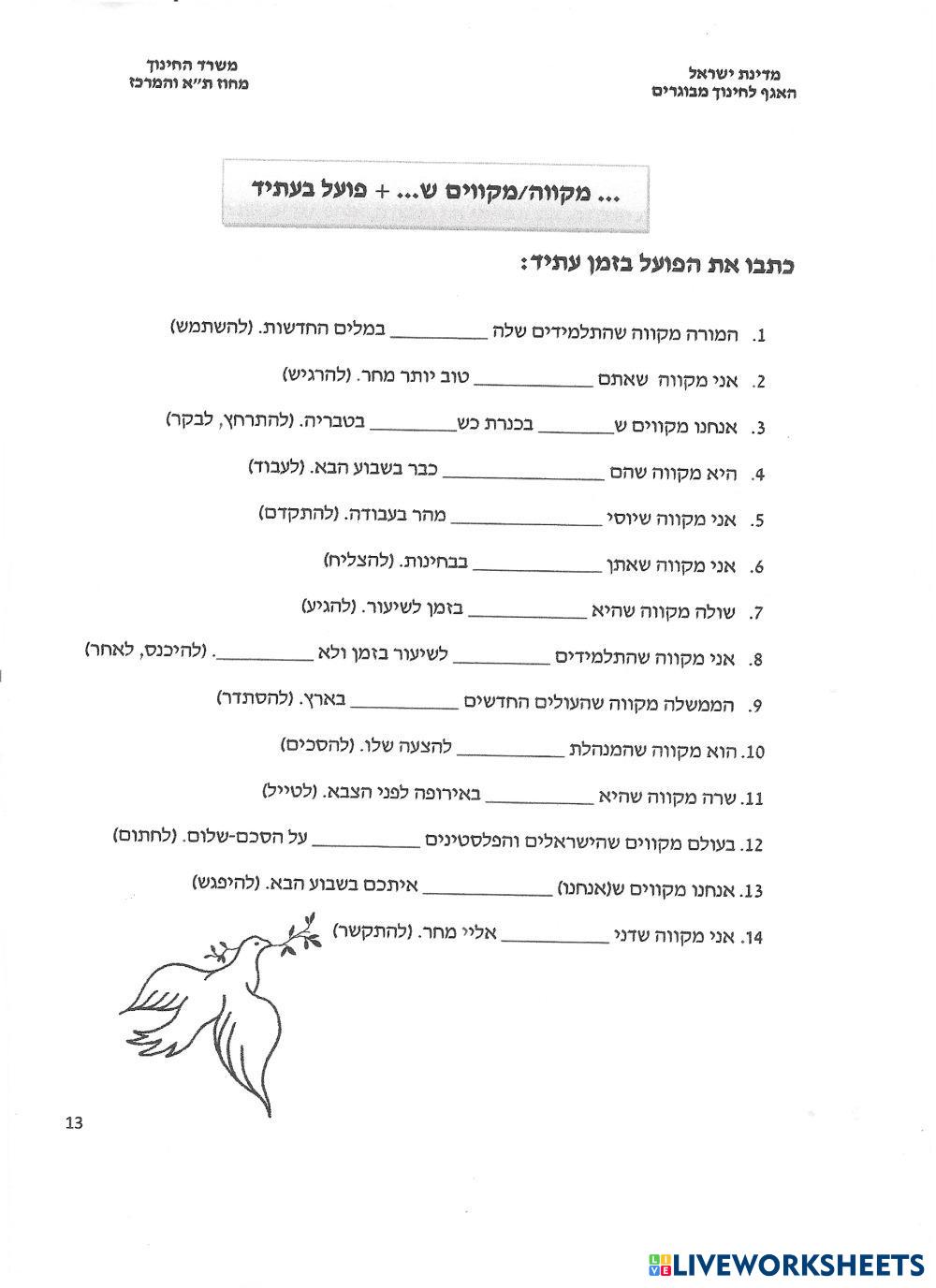 Created byanat aviv ESL Hebrew B1 (Intermedio Bajo) Gramática Hebrew (modern) Instrucciones del autor השלימו My Google Classroom Courses × 0 classes selected (0 students total) Quick Access Select all classes (0 classes) All Classes Loading courses... Cancelar Share Share to selected Course __COURSE_NAME__ __STUDENT_NAME__ (__STUDENT_EMAIL__) עתיד לפי שם פועל Descargar Worksheet Validation Comprobar mis respuestas Emails my answers to my teacher Nombre completo Group/level Asignatura Teacher's email or key code Close Submit Validating worksheet... (12) Your answers have been sent to your teacher. Good luck! OK We encountered an error submitting your answers. Please try again. OK Anuncio | Ir sin anuncios Created byanat aviv ESL Hebrew B1 (Intermedio Bajo) Gramática Hebrew (modern) Instrucciones del autor השלימו Explora las hojas de trabajo תרגול פרק הלשון מבגרות עולים ג - חשיבות השינה ESL B1 תרגול פרק הלשון מבגרות עולים ג - חשיבות השינה Grammar - ESL קראו והשלימו מילת היחס "את" בנטייה ESL B1 מילת היחס "את" בנטייה Grammar - ESL - הציווי: רמה ג', מטרה 45 ESL B1 הציווי: רמה ג', מטרה 45 Grammar - ESL השלימו את המשפטים בצורת הציווי