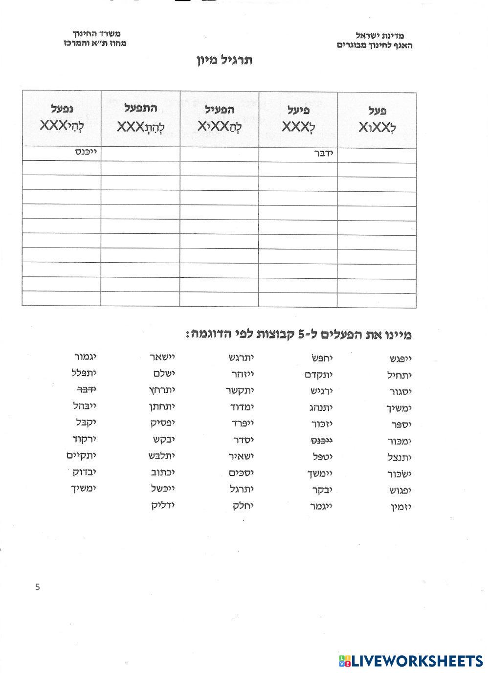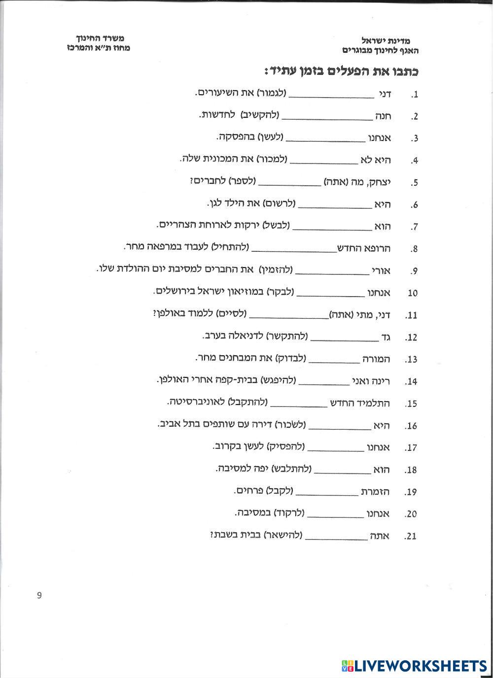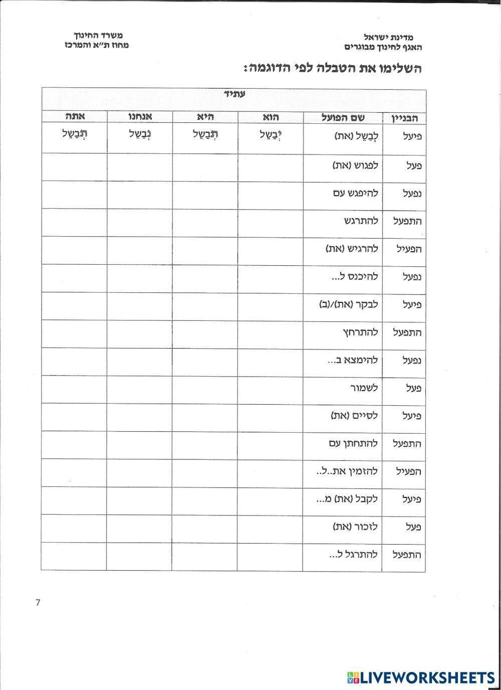 Created byanat aviv ESL Hebrew B1 (Intermedio Bajo) Gramática Hebrew (modern) Instrucciones del autor השלימו My Google Classroom Courses × 0 classes selected (0 students total) Quick Access Select all classes (0 classes) All Classes Loading courses... Cancelar Share Share to selected Course __COURSE_NAME__ __STUDENT_NAME__ (__STUDENT_EMAIL__) עתיד לפי שם פועל Descargar Worksheet Validation Comprobar mis respuestas Emails my answers to my teacher Nombre completo Group/level Asignatura Teacher's email or key code Close Submit Validating worksheet... (12) Your answers have been sent to your teacher. Good luck! OK We encountered an error submitting your answers. Please try again. OK Anuncio | Ir sin anuncios Created byanat aviv ESL Hebrew B1 (Intermedio Bajo) Gramática Hebrew (modern) Instrucciones del autor השלימו Explora las hojas de trabajo תרגול פרק הלשון מבגרות עולים ג - חשיבות השינה ESL B1 תרגול פרק הלשון מבגרות עולים ג - חשיבות השינה Grammar - ESL קראו והשלימו מילת היחס "את" בנטייה ESL B1 מילת היחס "את" בנטייה Grammar - ESL - הציווי: רמה ג', מטרה 45 ESL B1 הציווי: רמה ג', מטרה 45 Grammar - ESL השלימו את המשפטים בצורת הציווי