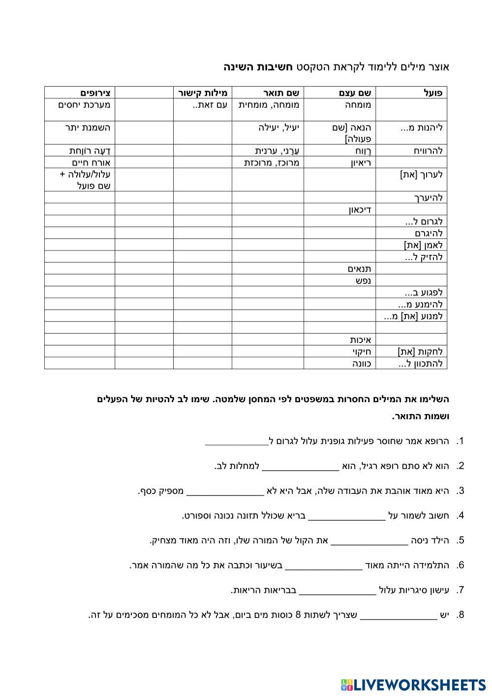 Created byanat aviv ESL Hebrew B1 (Intermedio Bajo) Vocabulario Hebrew (modern) Instrucciones del autor למדו את המילים והשלימו את המשפטים My Google Classroom Courses × 0 classes selected (0 students total) Quick Access Select all classes (0 classes) All Classes Loading courses... Cancelar Share Share to selected Course __COURSE_NAME__ __STUDENT_NAME__ (__STUDENT_EMAIL__) לימוד ותרגול אוצר מילים לקראת הטקסט 'חשיבות השינה' Descargar Worksheet Validation Comprobar mis respuestas Emails my answers to my teacher Nombre completo Group/level Asignatura Teacher's email or key code Close Submit Validating worksheet... (12) Your answers have been sent to your teacher. Good luck! OK We encountered an error submitting your answers. Please try again. OK Anuncio | Ir sin anuncios Created byanat aviv ESL Hebrew B1 (Intermedio Bajo) Vocabulario Hebrew (modern) Instrucciones del autor למדו את המילים והשלימו את המשפטים Explora las hojas de trabajo Keep Thinking Workbook, pp. 14-15 ESL B1 Keep Thinking Workbook, pp. 14-15 Vocabulary - ESL Complete the 2 exercises and submit אוצר מילים ESL B1 אוצר מילים Vocabulary - ESL - Band II – Unit 8 – Test (Tire – Zone) ESL B1 Band II – Unit 8 – Test (Tire – Zone) Vocabulary - ESL Vocabulary Practice Band II – Unit 7 – Test (savings - tin) ESL B1 Band II – Unit 7 – Test (savings - tin) Vocabulary - ESL Vocabulary Practice