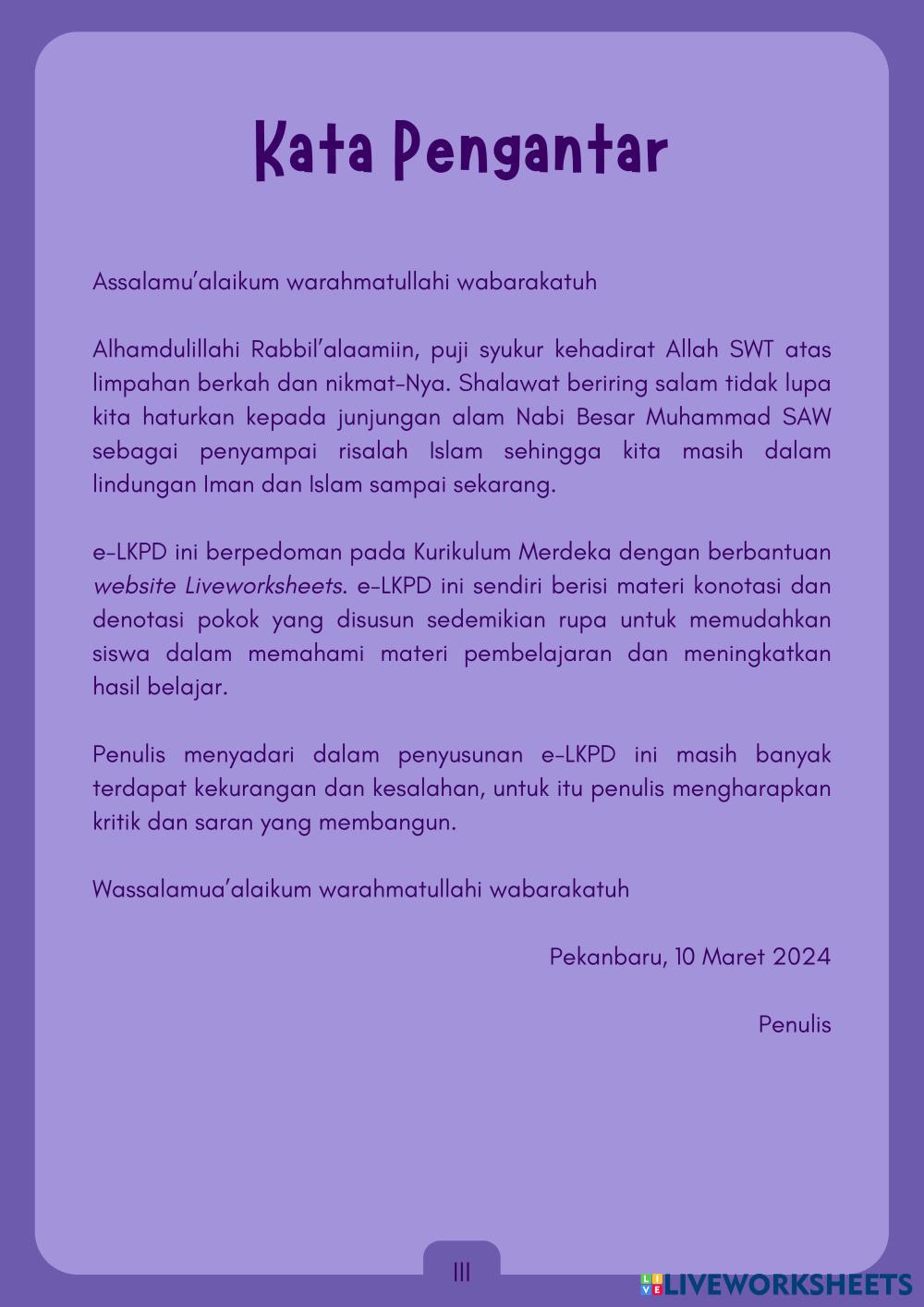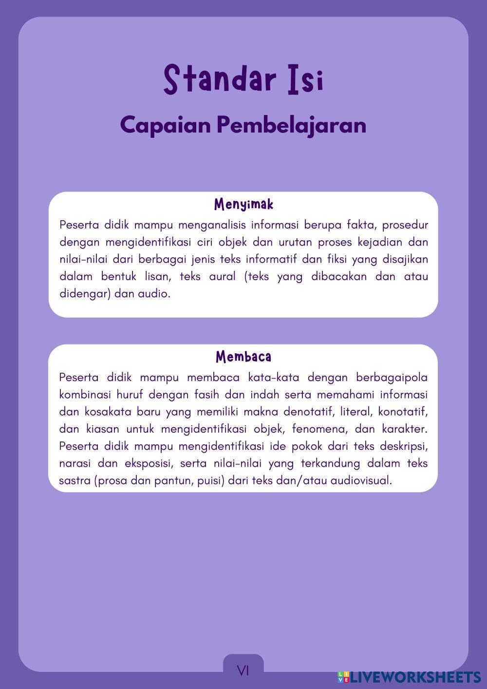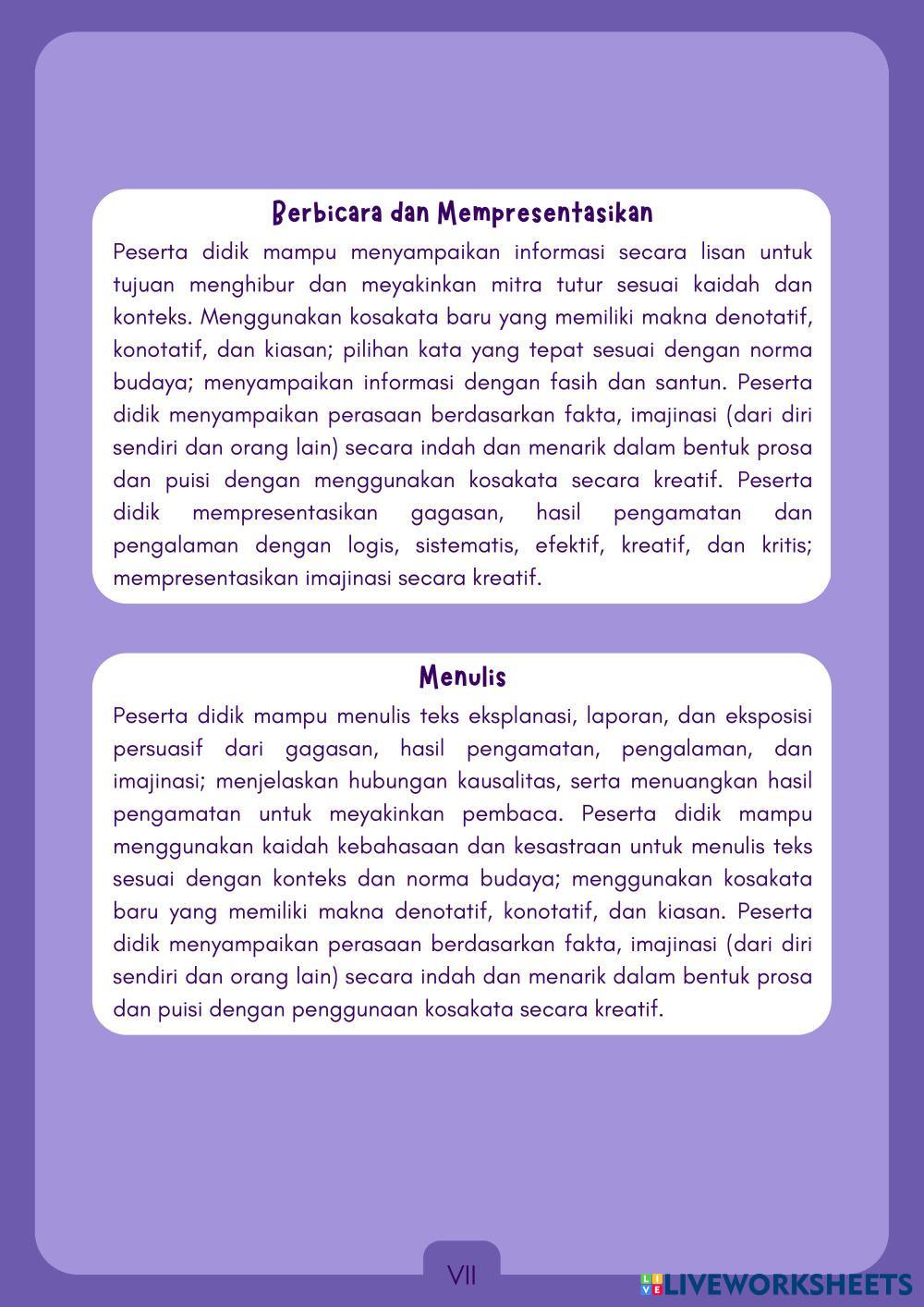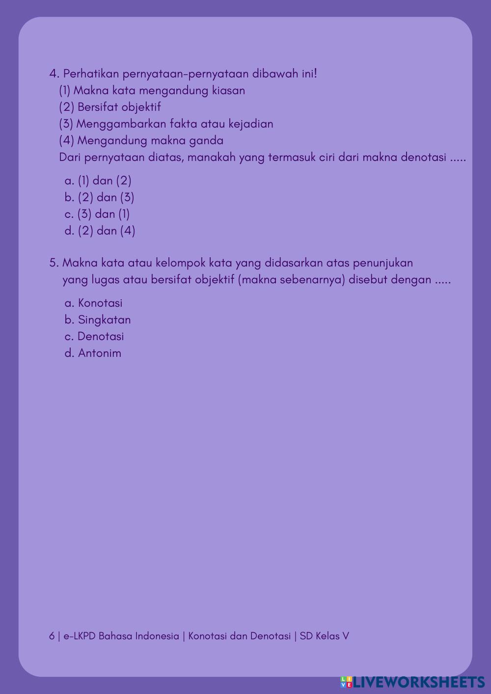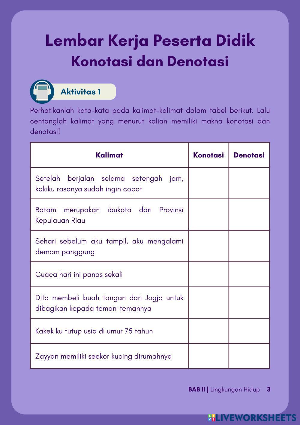 Created byVeronita Noer Cholik Julyani Syah Putri Bahasa Indonesia Konotasi dan Denotasi Edad 10-14 level: 5 Indonesian Instrucciones del autor My Google Classroom Courses × 0 classes selected (0 students total) Quick Access Select all classes (0 classes) All Classes Loading courses... Cancelar Share Share to selected Course __COURSE_NAME__ __STUDENT_NAME__ (__STUDENT_EMAIL__) e-LKPD Konotasi dan Denotasi Descargar Worksheet Validation Comprobar mis respuestas Emails my answers to my teacher Nombre completo Group/level Asignatura Teacher's email or key code Close Submit Validating worksheet... (12) Your answers have been sent to your teacher. Good luck! OK We encountered an error submitting your answers. Please try again. OK Anuncio | Ir sin anuncios Created byVeronita Noer Cholik Julyani Syah Putri Bahasa Indonesia Konotasi dan Denotasi Edad 10-14 level: 5 Indonesian Instrucciones del autor