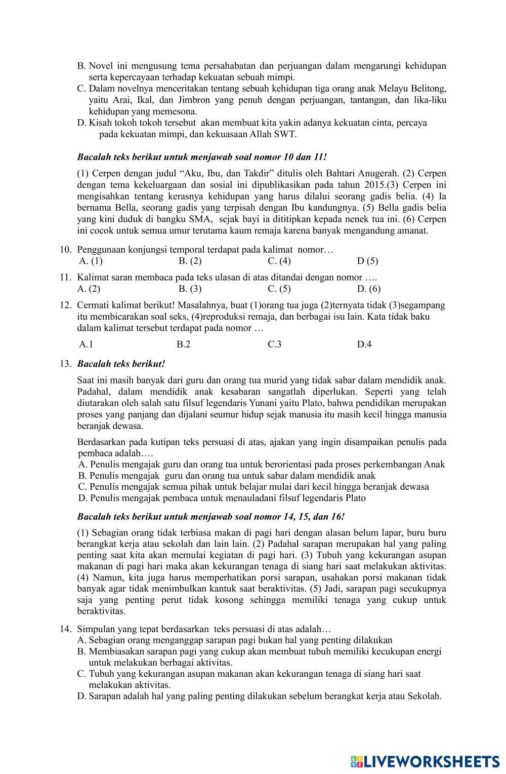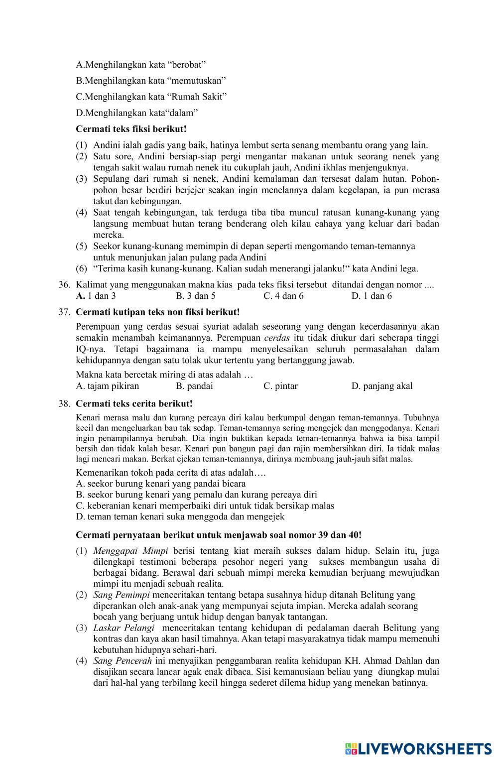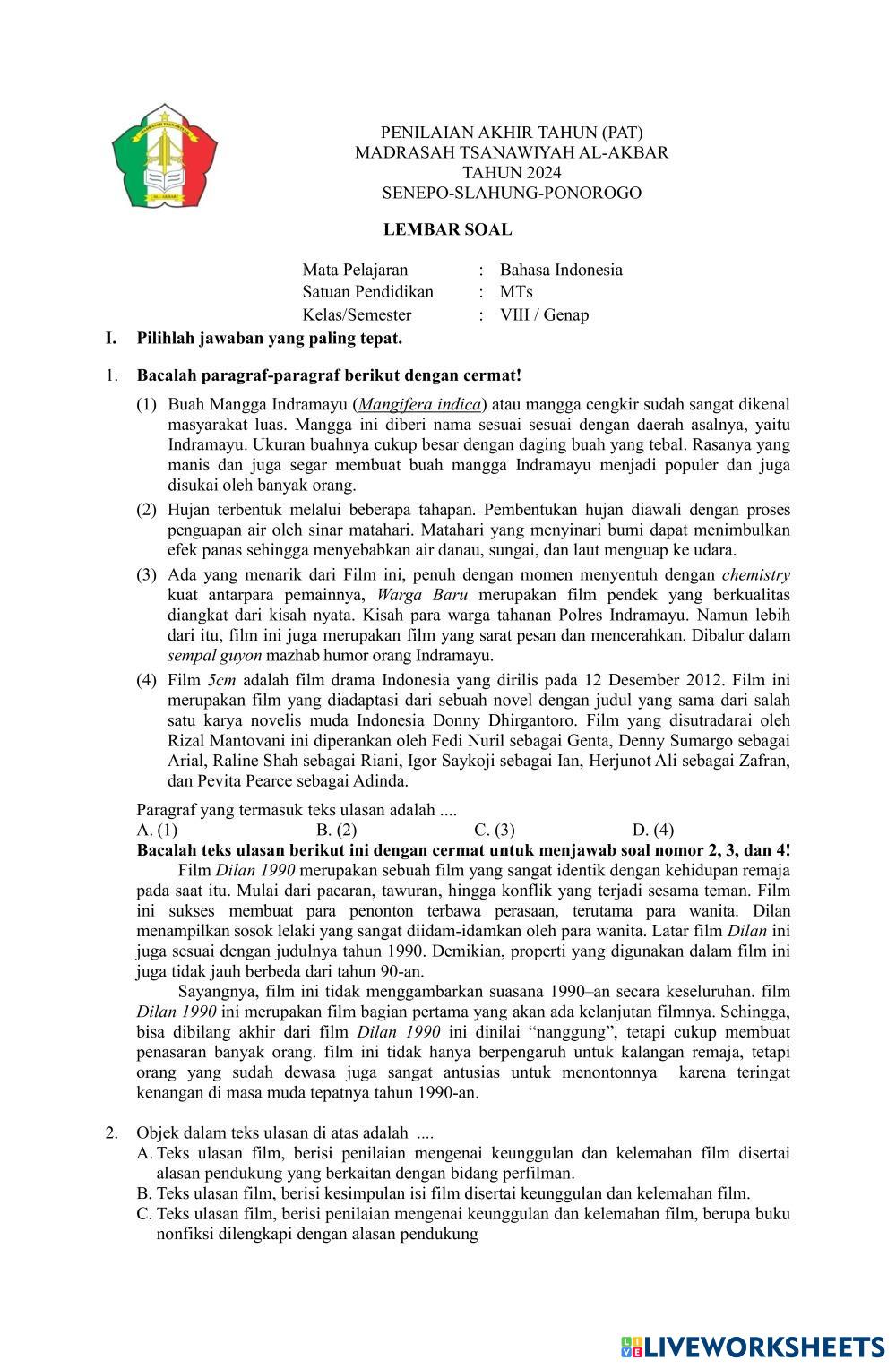 Created bymadrasah alakbar Bahasa Indonesia Soal PAT Bahasa Indonesia Edad 12-17 level: 8 Indonesian Instrucciones del autor My Google Classroom Courses × 0 classes selected (0 students total) Quick Access Select all classes (0 classes) All Classes Loading courses... Cancelar Share Share to selected Course __COURSE_NAME__ __STUDENT_NAME__ (__STUDENT_EMAIL__) PAT 8 B.Indonesia Descargar Worksheet Validation Comprobar mis respuestas Emails my answers to my teacher Nombre completo Group/level Asignatura Teacher's email or key code Close Submit Validating worksheet... (12) Your answers have been sent to your teacher. Good luck! OK We encountered an error submitting your answers. Please try again. OK Anuncio | Ir sin anuncios Created bymadrasah alakbar Bahasa Indonesia Soal PAT Bahasa Indonesia Edad 12-17 level: 8 Indonesian Instrucciones del autor