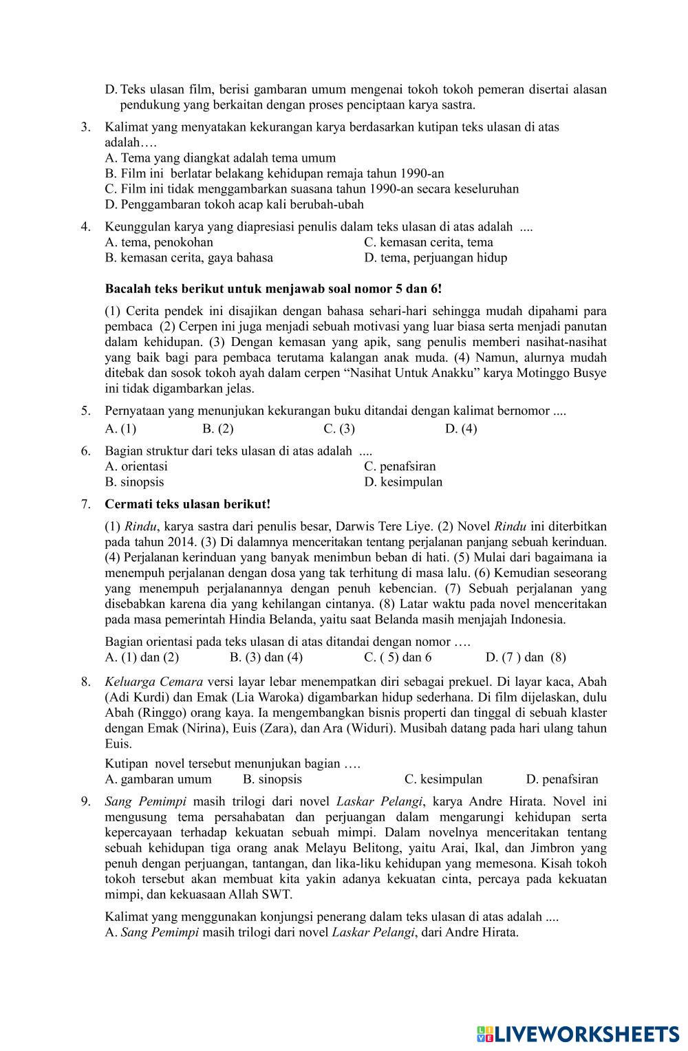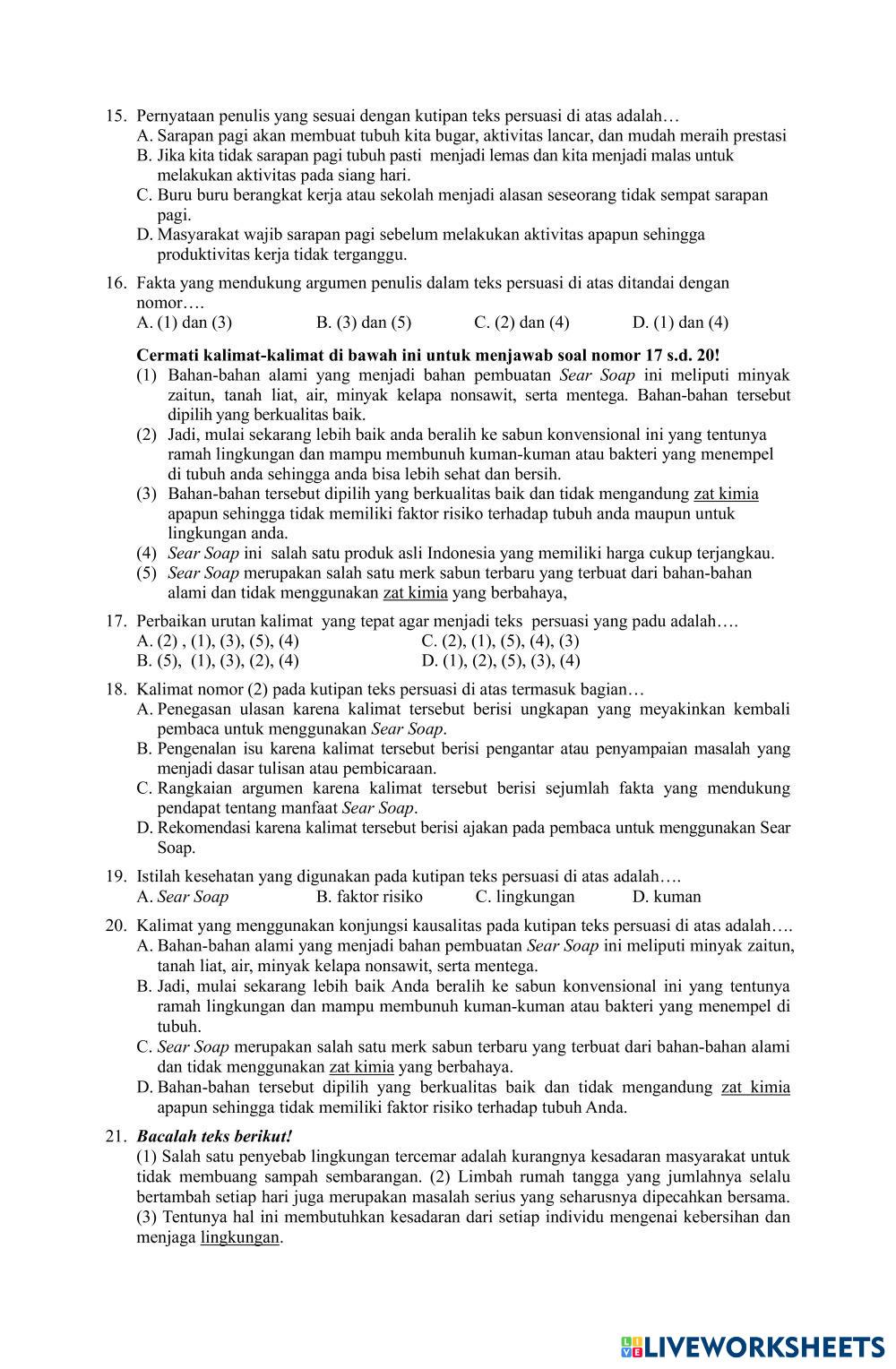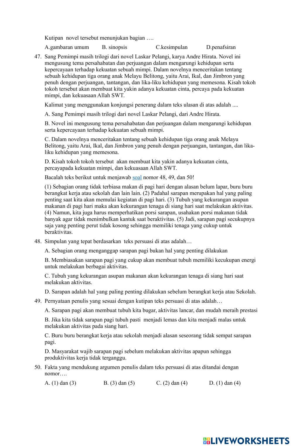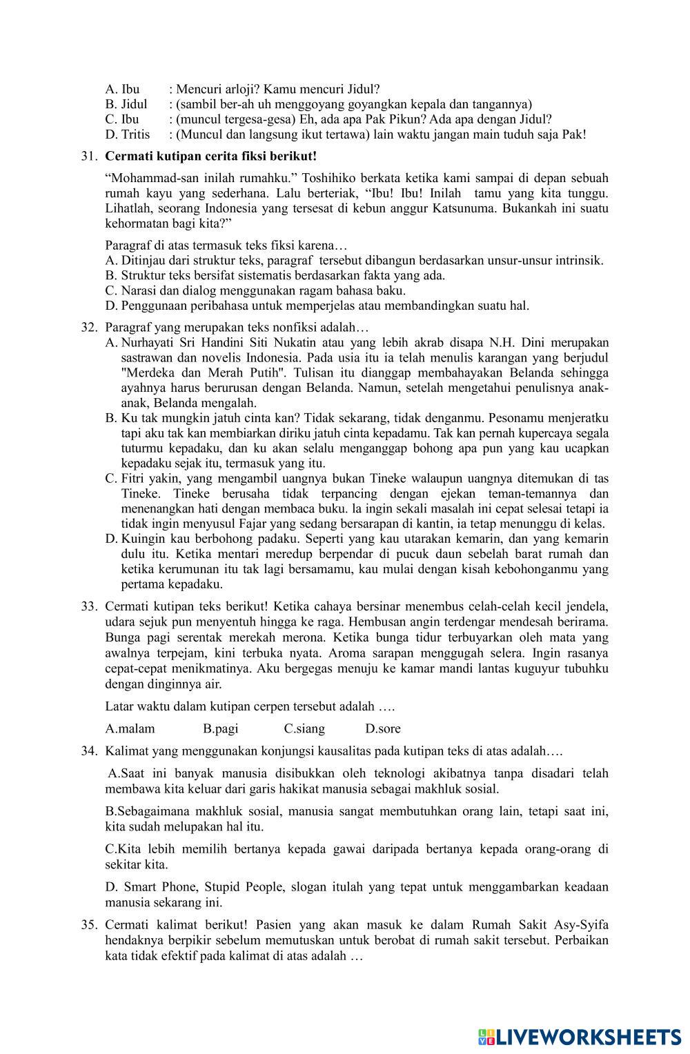 Created bymadrasah alakbar Bahasa Indonesia Soal PAT Bahasa Indonesia Edad 12-17 level: 8 Indonesian Instrucciones del autor My Google Classroom Courses × 0 classes selected (0 students total) Quick Access Select all classes (0 classes) All Classes Loading courses... Cancelar Share Share to selected Course __COURSE_NAME__ __STUDENT_NAME__ (__STUDENT_EMAIL__) PAT 8 B.Indonesia Descargar Worksheet Validation Comprobar mis respuestas Emails my answers to my teacher Nombre completo Group/level Asignatura Teacher's email or key code Close Submit Validating worksheet... (12) Your answers have been sent to your teacher. Good luck! OK We encountered an error submitting your answers. Please try again. OK Anuncio | Ir sin anuncios Created bymadrasah alakbar Bahasa Indonesia Soal PAT Bahasa Indonesia Edad 12-17 level: 8 Indonesian Instrucciones del autor