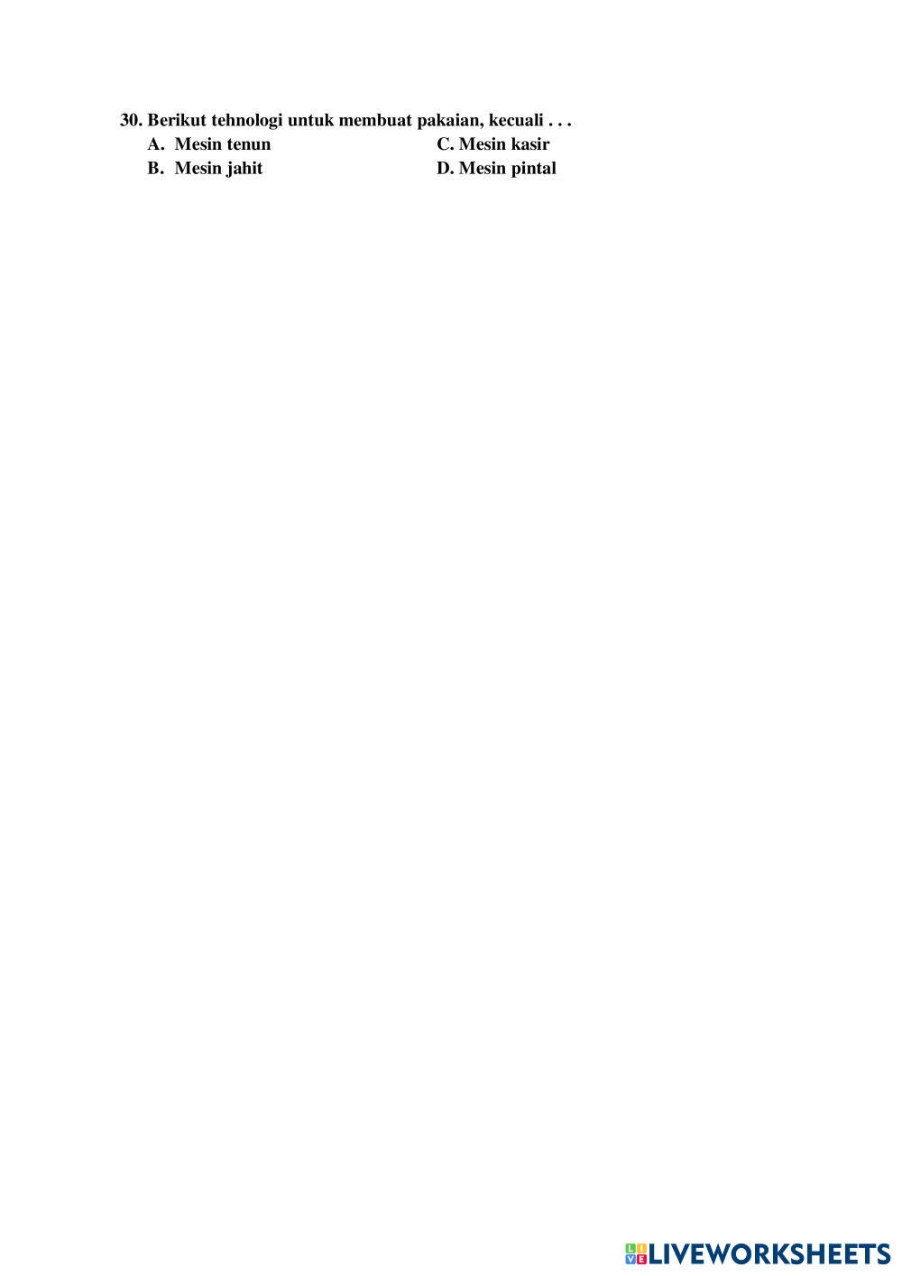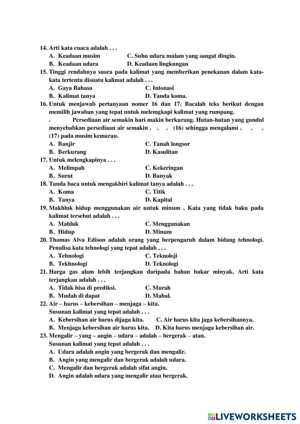 Created by sitiebar Bahasa Indonesia Soal PAT Bahasa Indonesia Edad 7-13 level: 3 Indonesian Instrucciones del autor My Google Classroom Courses × 0 classes selected (0 students total) Quick Access Select all classes (0 classes) All Classes Loading courses... Cancelar Share Share to selected Course __COURSE_NAME__ __STUDENT_NAME__ (__STUDENT_EMAIL__) mi. hid. mub.dempel Descargar Worksheet Validation Comprobar mis respuestas Emails my answers to my teacher Nombre completo Group/level Asignatura Teacher's email or key code Close Submit Validating worksheet... (12) Your answers have been sent to your teacher. Good luck! OK We encountered an error submitting your answers. Please try again. OK Anuncio | Ir sin anuncios Created by sitiebar Bahasa Indonesia Soal PAT Bahasa Indonesia Edad 7-13 level: 3 Indonesian Instrucciones del autor