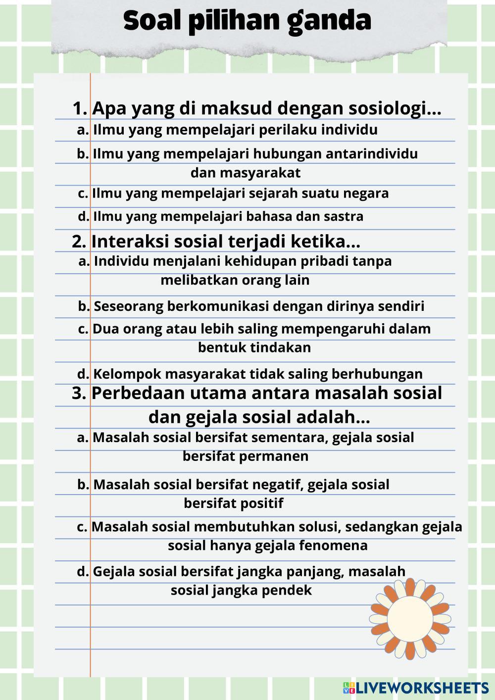 Created byFitriaJuliana Education Education Edad 16+ level: easy Indonesian Instrucciones del autor My Google Classroom Courses × 0 classes selected (0 students total) Quick Access Select all classes (0 classes) All Classes Loading courses... Cancelar Share Share to selected Course __COURSE_NAME__ __STUDENT_NAME__ (__STUDENT_EMAIL__) SOSIOLOGI KELAS 10 Descargar Worksheet Validation Comprobar mis respuestas Emails my answers to my teacher Nombre completo Group/level Asignatura Teacher's email or key code Close Submit Validating worksheet... (12) Your answers have been sent to your teacher. Good luck! OK We encountered an error submitting your answers. Please try again. OK Anuncio | Ir sin anuncios Created byFitriaJuliana Education Education Edad 16+ level: easy Indonesian Instrucciones del autor