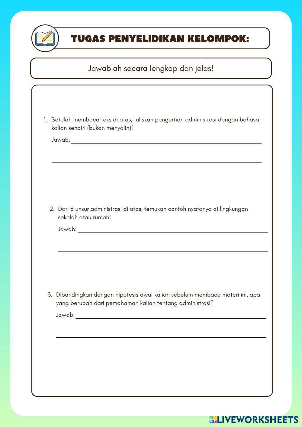 Created by auraaulia ESL Indonesian B2 (Intermedio Alto) Escritura Indonesian Instrucciones del autor Jawabah pertanyaan berikut dengan benar! My Google Classroom Courses × 0 classes selected (0 students total) Quick Access Select all classes (0 classes) All Classes Loading courses... Cancelar Share Share to selected Course __COURSE_NAME__ __STUDENT_NAME__ (__STUDENT_EMAIL__) LKPD ADMINISTRASI PERKANTORAN KELAS X SMK Descargar Worksheet Validation Comprobar mis respuestas Emails my answers to my teacher Nombre completo Group/level Asignatura Teacher's email or key code Close Submit Validating worksheet... (12) Your answers have been sent to your teacher. Good luck! OK We encountered an error submitting your answers. Please try again. OK Anuncio | Ir sin anuncios Created by auraaulia ESL Indonesian B2 (Intermedio Alto) Escritura Indonesian Instrucciones del autor Jawabah pertanyaan berikut dengan benar! Explora las hojas de trabajo LKPD Google Collab ESL B2 LKPD Google Collab Writing - ESL Kerjakan LKPD di bawah ini bersama kelompok mu! LKPD KELANGKAAN KELAS 10 SMA ESL B2 LKPD KELANGKAAN KELAS 10 SMA Writing - ESL Jawablah pertanyaan tersebut dengan benar dan jelas! Pakta integritas ESL B2 Pakta integritas Writing - ESL Kerjakan Rangkuman ESL B2 Rangkuman Writing - ESL Tulis rangkumanmu disini
