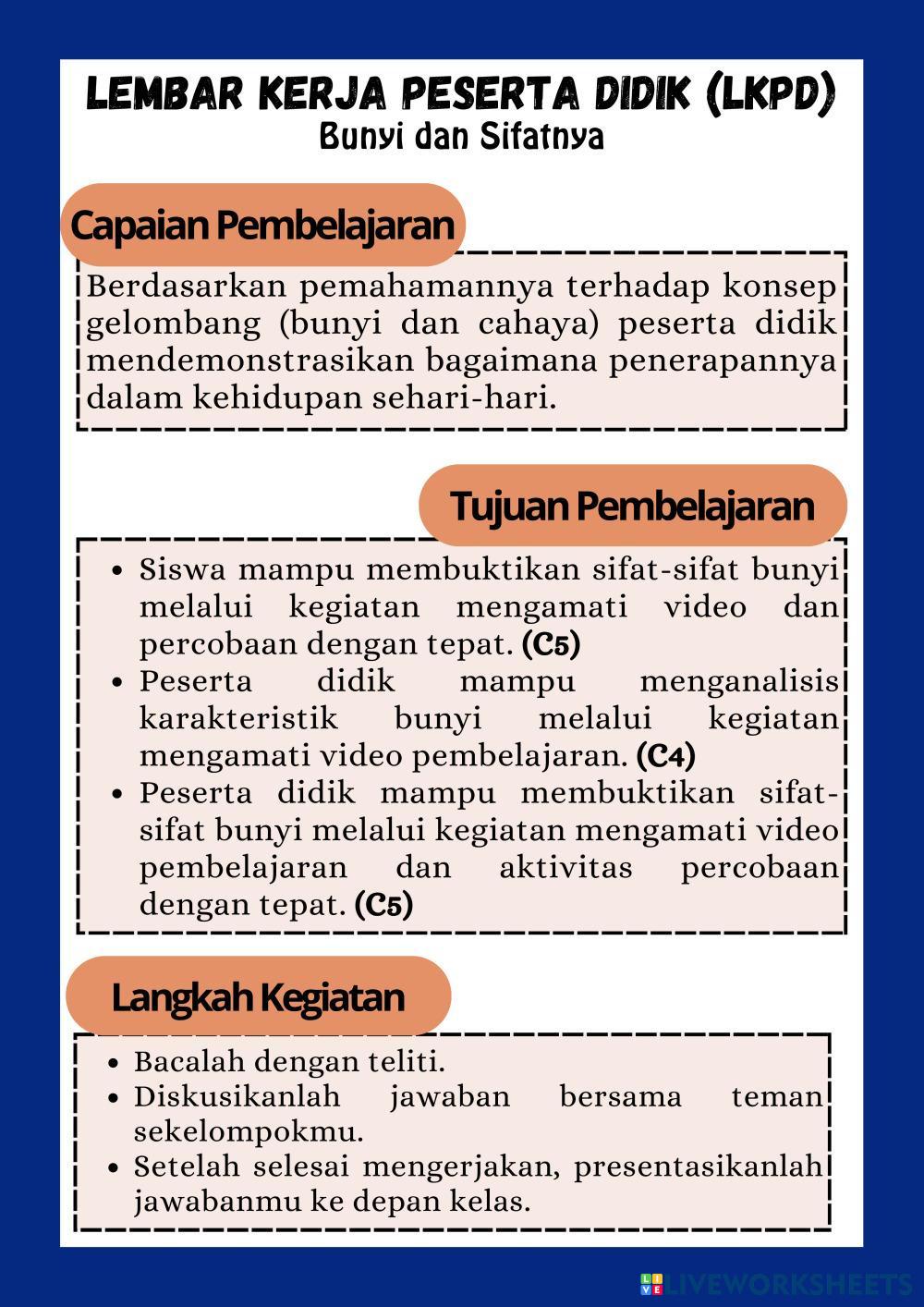 Created by Wulan13 Ilmu Pengetahuan Alam dan Sosial (IPAS) BUNYI DAN SIFATNYA Edad 11-15 level: 5 Indonesian Author's Instructions My Google Classroom Courses × 0 classes selected (0 students total) Quick Access Select all classes (0 classes) All Classes Loading courses... Cancelar Share Share to selected Course __COURSE_NAME__ __STUDENT_NAME__ (__STUDENT_EMAIL__) Bunyi dan Sifatnya Download Worksheet Validation Comprobar mis respuestas Emails my answers to my teacher Nombre completo Group/level Asignatura Teacher's email or key code Close Submit Validating worksheet... (12) Your answers have been sent to your teacher. Good luck! OK We encountered an error submitting your answers. Please try again. OK Anuncio | Ir sin anuncios Created by Wulan13 Ilmu Pengetahuan Alam dan Sosial (IPAS) BUNYI DAN SIFATNYA Edad 11-15 level: 5 Indonesian Author's Instructions