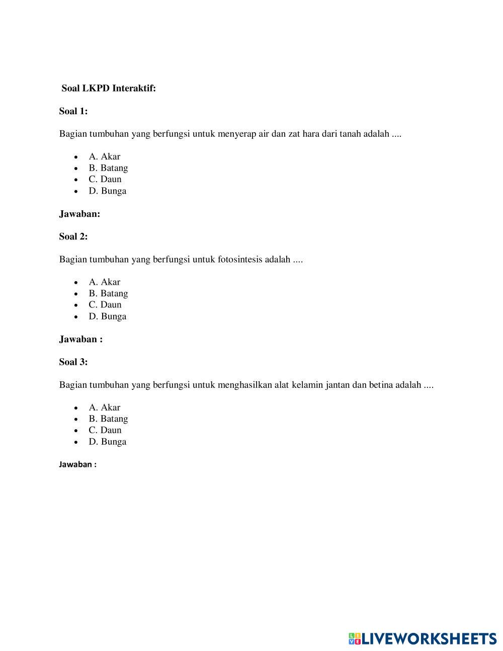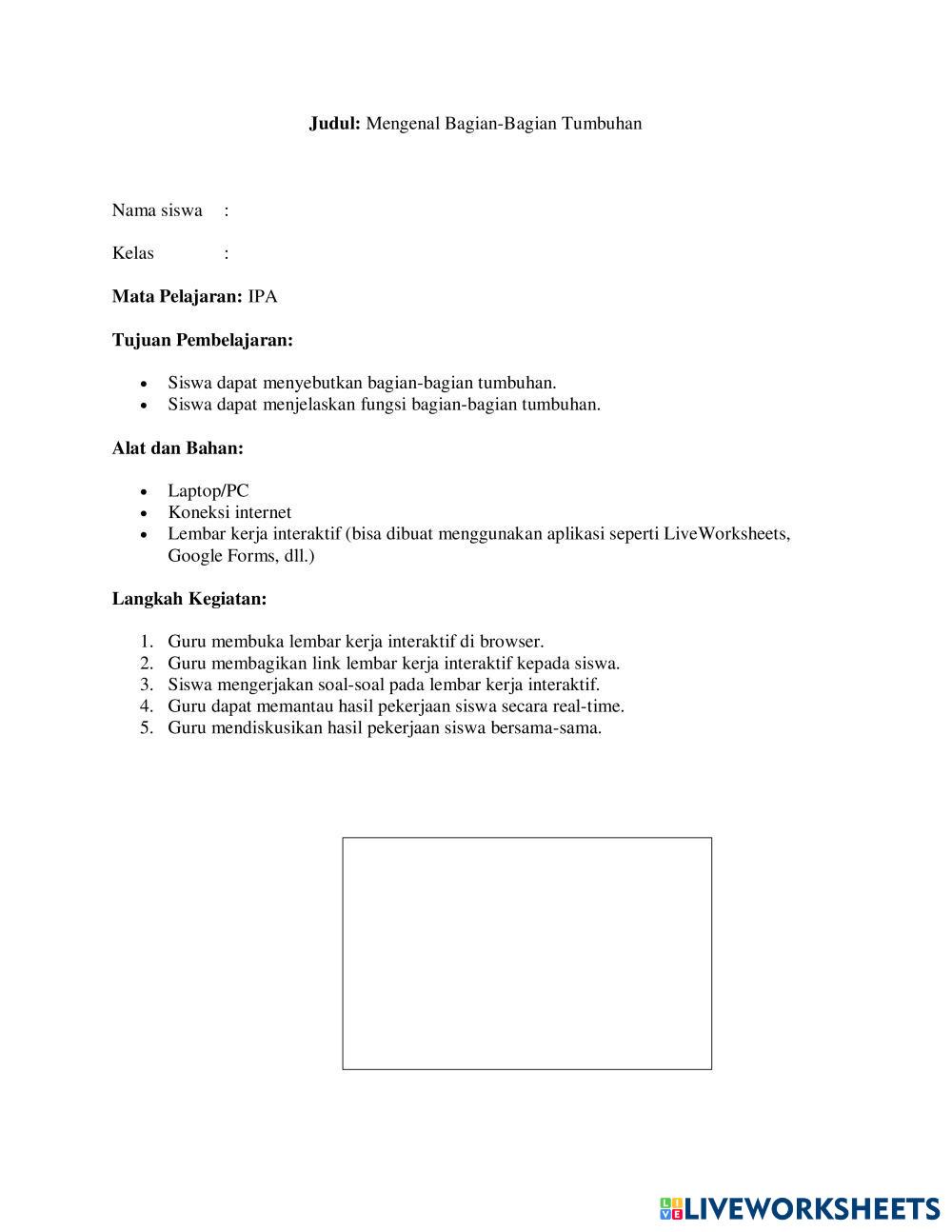Created byFajri Laili, S.Pd Ilmu Pengetahuan Alam (IPA) Bagian tumbuhan Edad 15-18 level: Kelas X Indonesian Instrucciones del autor My Google Classroom Courses × 0 classes selected (0 students total) Quick Access Select all classes (0 classes) All Classes Loading courses... Cancelar Share Share to selected Course __COURSE_NAME__ __STUDENT_NAME__ (__STUDENT_EMAIL__) Mengenal bagian-bagian tumbuhan Descargar Worksheet Validation Comprobar mis respuestas Emails my answers to my teacher Nombre completo Group/level Asignatura Teacher's email or key code Close Submit Validating worksheet... (12) Your answers have been sent to your teacher. Good luck! OK We encountered an error submitting your answers. Please try again. OK Anuncio | Ir sin anuncios Created byFajri Laili, S.Pd Ilmu Pengetahuan Alam (IPA) Bagian tumbuhan Edad 15-18 level: Kelas X Indonesian Instrucciones del autor