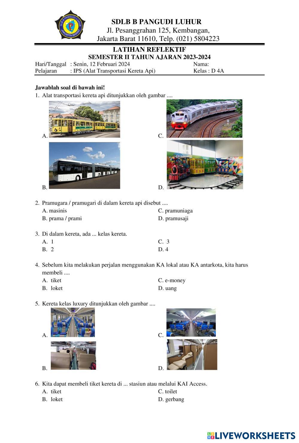 Created byRatrika Cinta Angela de Merici Ilmu Pengetahuan Sosial (IPS) Alat Transportasi Edad 10-18 level: SDLB Indonesian Instrucciones del autor My Google Classroom Courses × 0 classes selected (0 students total) Quick Access Select all classes (0 classes) All Classes Loading courses... Cancelar Share Share to selected Course __COURSE_NAME__ __STUDENT_NAME__ (__STUDENT_EMAIL__) Latihan Reflektif IPS Alat Transportasi Kereta Api Descargar Worksheet Validation Comprobar mis respuestas Emails my answers to my teacher Nombre completo Group/level Asignatura Teacher's email or key code Close Submit Validating worksheet... (12) Your answers have been sent to your teacher. Good luck! OK We encountered an error submitting your answers. Please try again. OK Anuncio | Ir sin anuncios Created byRatrika Cinta Angela de Merici Ilmu Pengetahuan Sosial (IPS) Alat Transportasi Edad 10-18 level: SDLB Indonesian Instrucciones del autor
