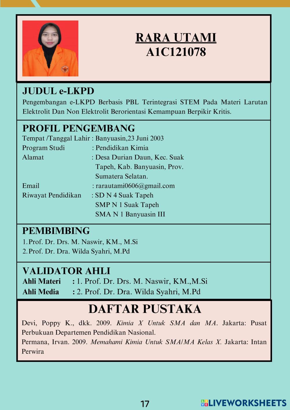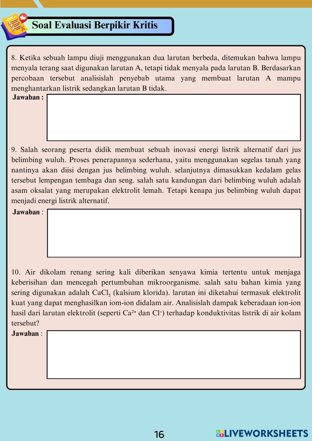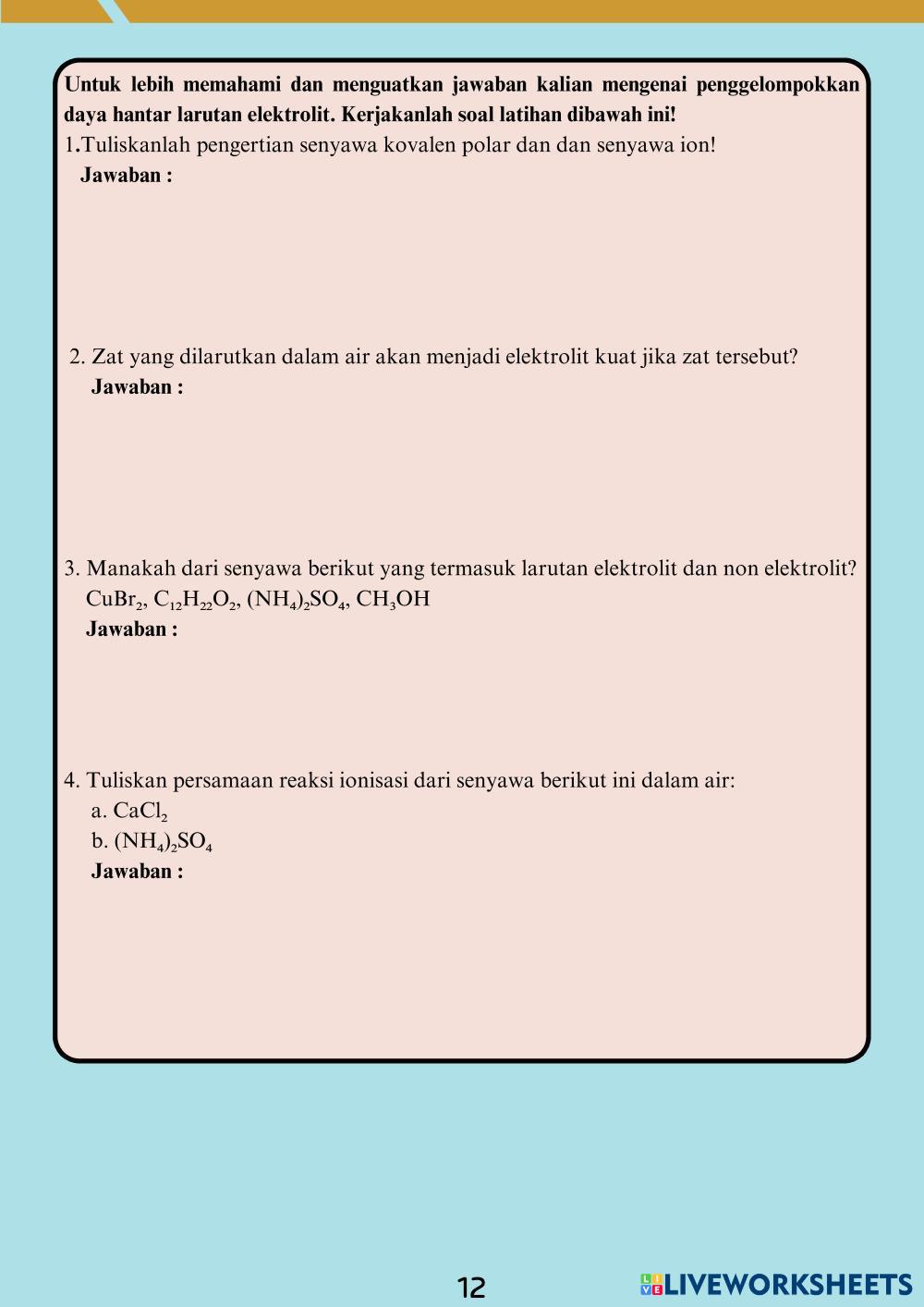 Created byRamiaaaa KIMIA Larutan Elektrolit dan Non Elektrolit Edad 15+ level: X Fase E2 Indonesian Author's Instructions My Google Classroom Courses × 0 classes selected (0 students total) Quick Access Select all classes (0 classes) All Classes Loading courses... Cancelar Share Share to selected Course __COURSE_NAME__ __STUDENT_NAME__ (__STUDENT_EMAIL__) Larutan elektrolit dan non elektrolit Download Worksheet Validation Comprobar mis respuestas Emails my answers to my teacher Nombre completo Group/level Asignatura Teacher's email or key code Close Submit Validating worksheet... (12) Your answers have been sent to your teacher. Good luck! OK We encountered an error submitting your answers. Please try again. OK Anuncio | Ir sin anuncios Created byRamiaaaa KIMIA Larutan Elektrolit dan Non Elektrolit Edad 15+ level: X Fase E2 Indonesian Author's Instructions