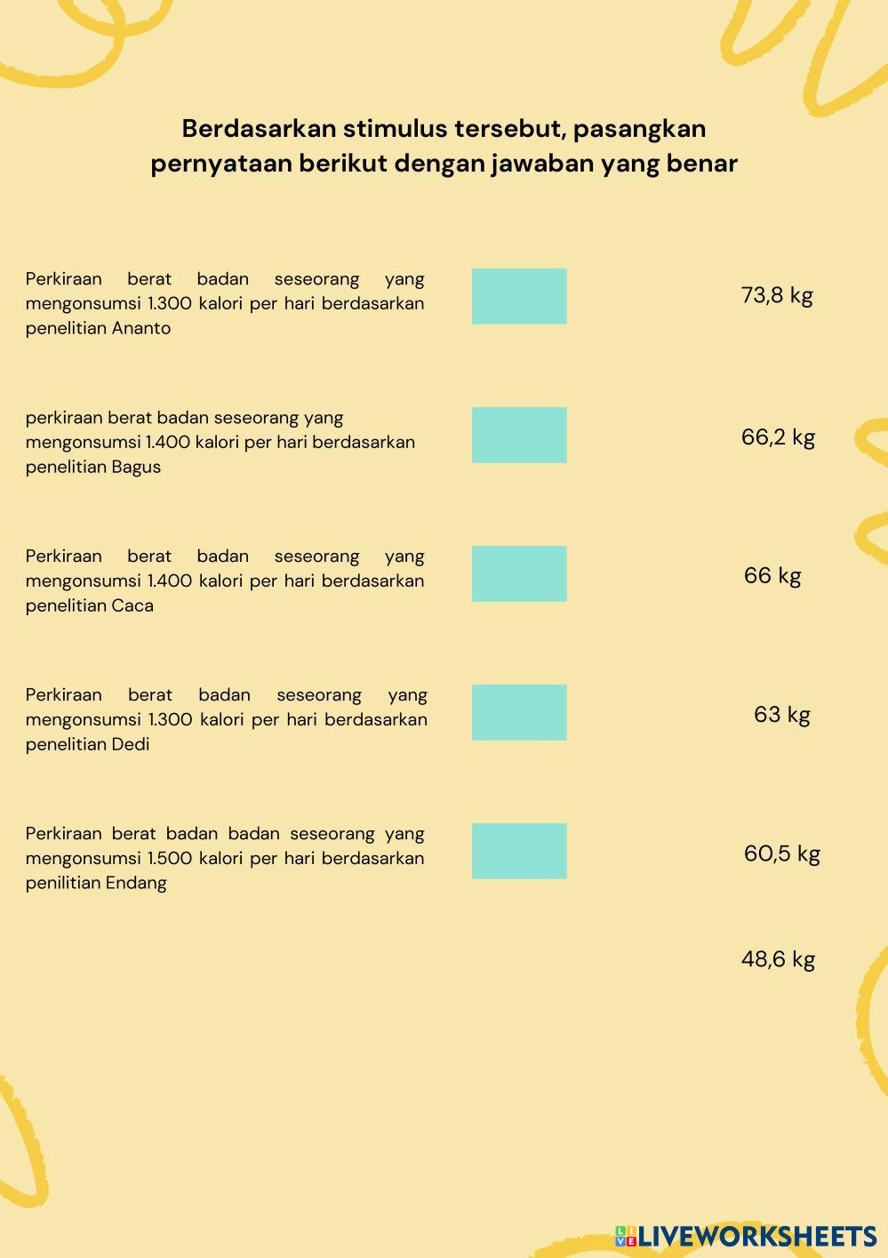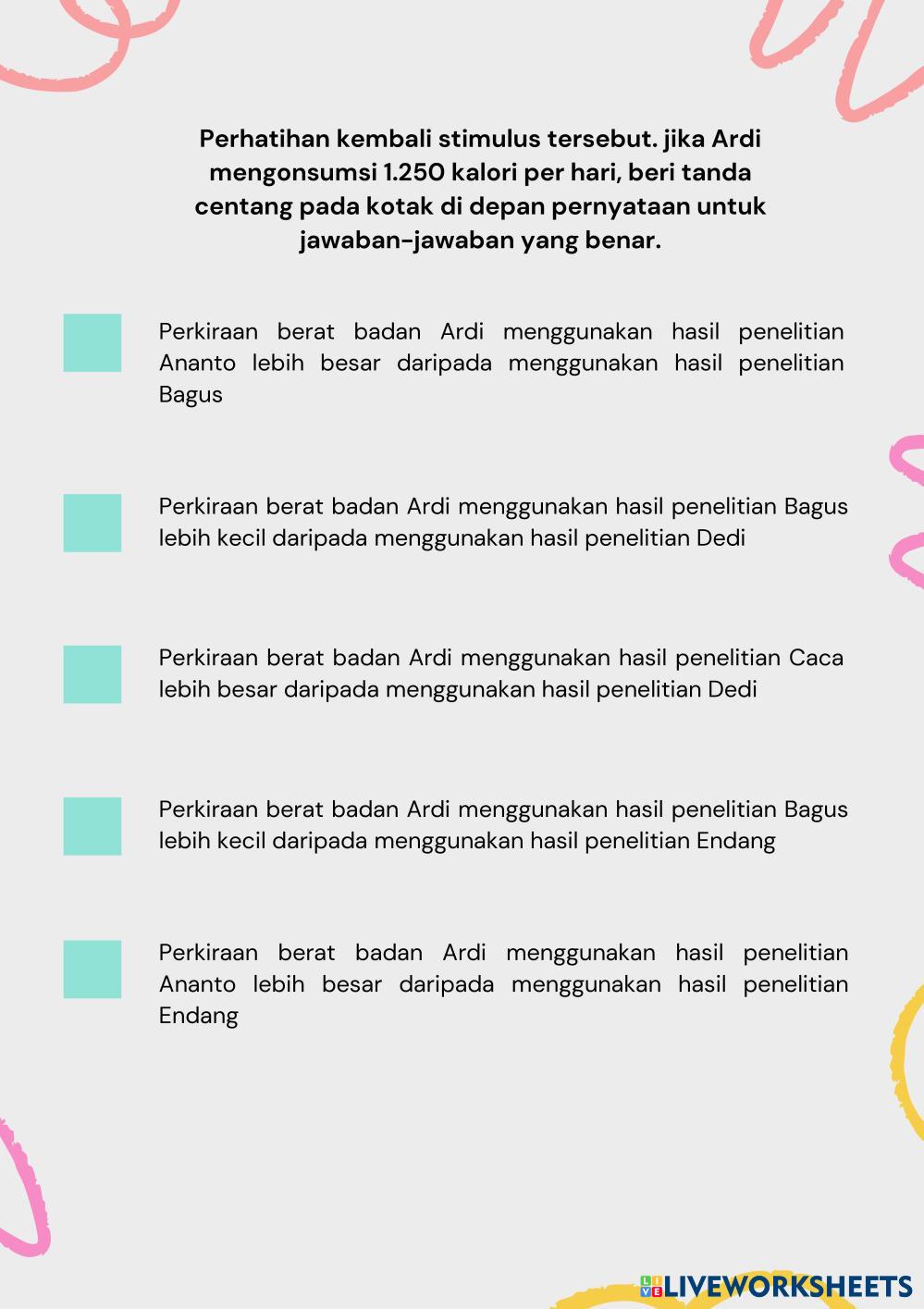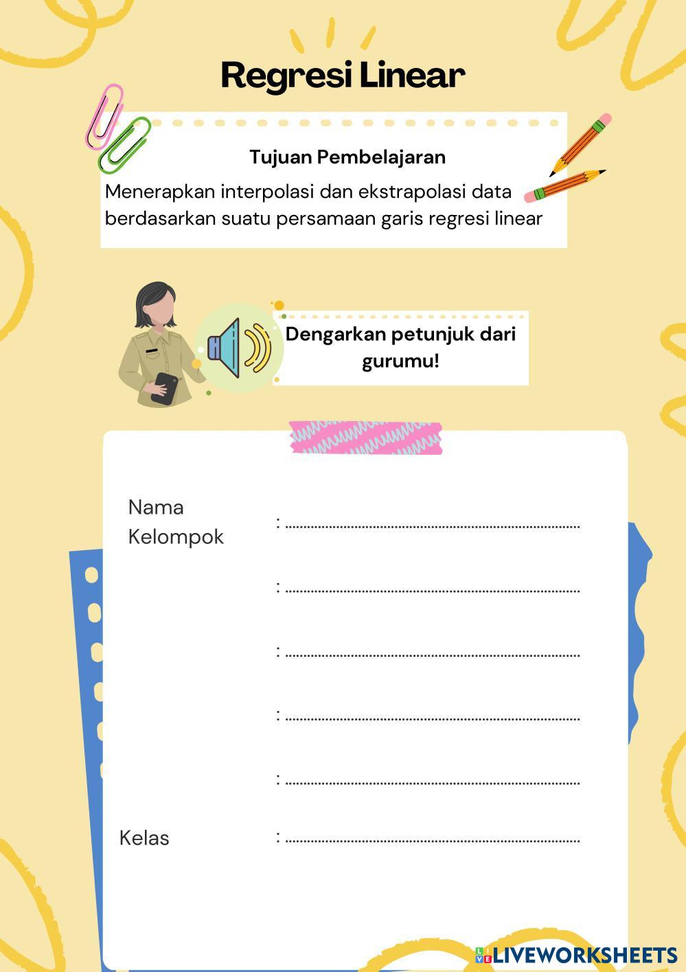 Created byEuodi Datuan MATEMATIKA WAJIB KELAS XI Regresi Linear Edad 16+ level: SMA Indonesian Instrucciones del autor Penerapan interpolasi dan ekstrapolasi data berdasarkan persamaan regresi linear My Google Classroom Courses × 0 classes selected (0 students total) Quick Access Select all classes (0 classes) All Classes Loading courses... Cancelar Share Share to selected Course __COURSE_NAME__ __STUDENT_NAME__ (__STUDENT_EMAIL__) Interpolasi dan Ekstrapolasi Descargar Worksheet Validation Comprobar mis respuestas Emails my answers to my teacher Nombre completo Group/level Asignatura Teacher's email or key code Close Submit Validating worksheet... (12) Your answers have been sent to your teacher. Good luck! OK We encountered an error submitting your answers. Please try again. OK Anuncio | Ir sin anuncios Created byEuodi Datuan MATEMATIKA WAJIB KELAS XI Regresi Linear Edad 16+ level: SMA Indonesian Instrucciones del autor Penerapan interpolasi dan ekstrapolasi data berdasarkan persamaan regresi linear